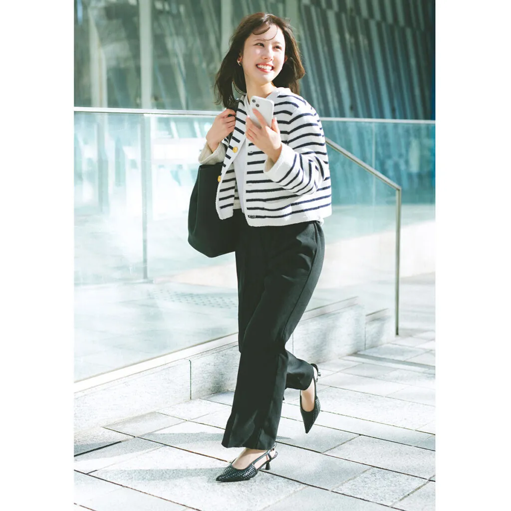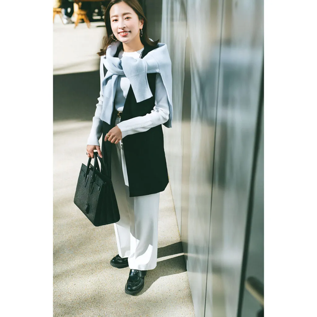 展示会の現場では立ちっぱなしが基本ですが、靴も意外と見られていることが多いと感じます。数年前に買ったPRADAのローファーはコーデをまとめてくれるだけでなく、高級感も演出してくれる名品。さらに、ヒールがしっかりしているので、立ちっぱなしでも疲れないのが長く愛用している理由です。裾から見えるトライアングルロゴが仕事中も気分を上げてくれるので、仕事中のモチベーションにもなっています。