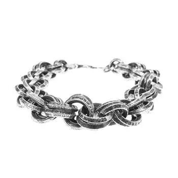 クロムハーツの中でも最も定番で人気が高いのが、チェーンタイプのブレスレット。ペーパーチェーンやキーパーチェーンなど、重厚感のあるシルバーリンクが連なるデザインは、手元に圧倒的な存在感を与えます。ストリート系やロックスタイルとの相性が抜群で、一本で主役級のインパクトを放ちます。