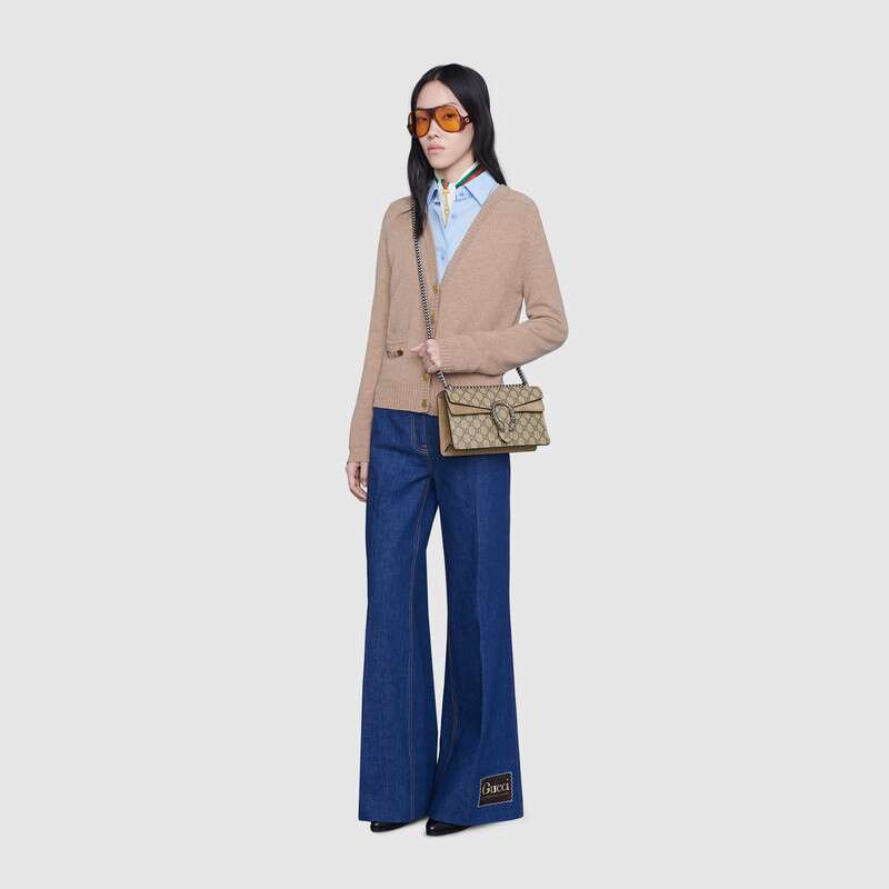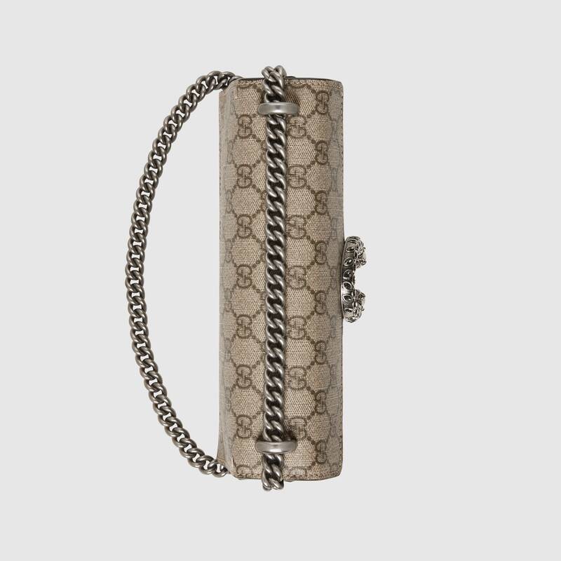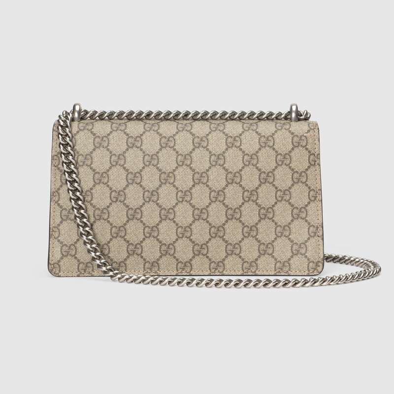 この小さなディオニュソスショルダーバッグは、クラシックなGGパターンとトープスエードのパイピングのディテールで装飾されています。 バッグは、ギリシャのワインディオニュソスの神に触発されたブランドの象徴的なタイガーヘッドバックル要素で細心の注意を払って装飾されています。神話や伝説では、彼はゼウスから送られたタイガーでチグリス川を渡りました。 光沢のあるクリスタルの装飾がバックルをより豪華にします。 スライディングチェーンストラップは、ショルダーバッグ、クロスボディバッグ、ハンドバッグの間で自由に変換できるさまざまな持ち運び方法を作成します。