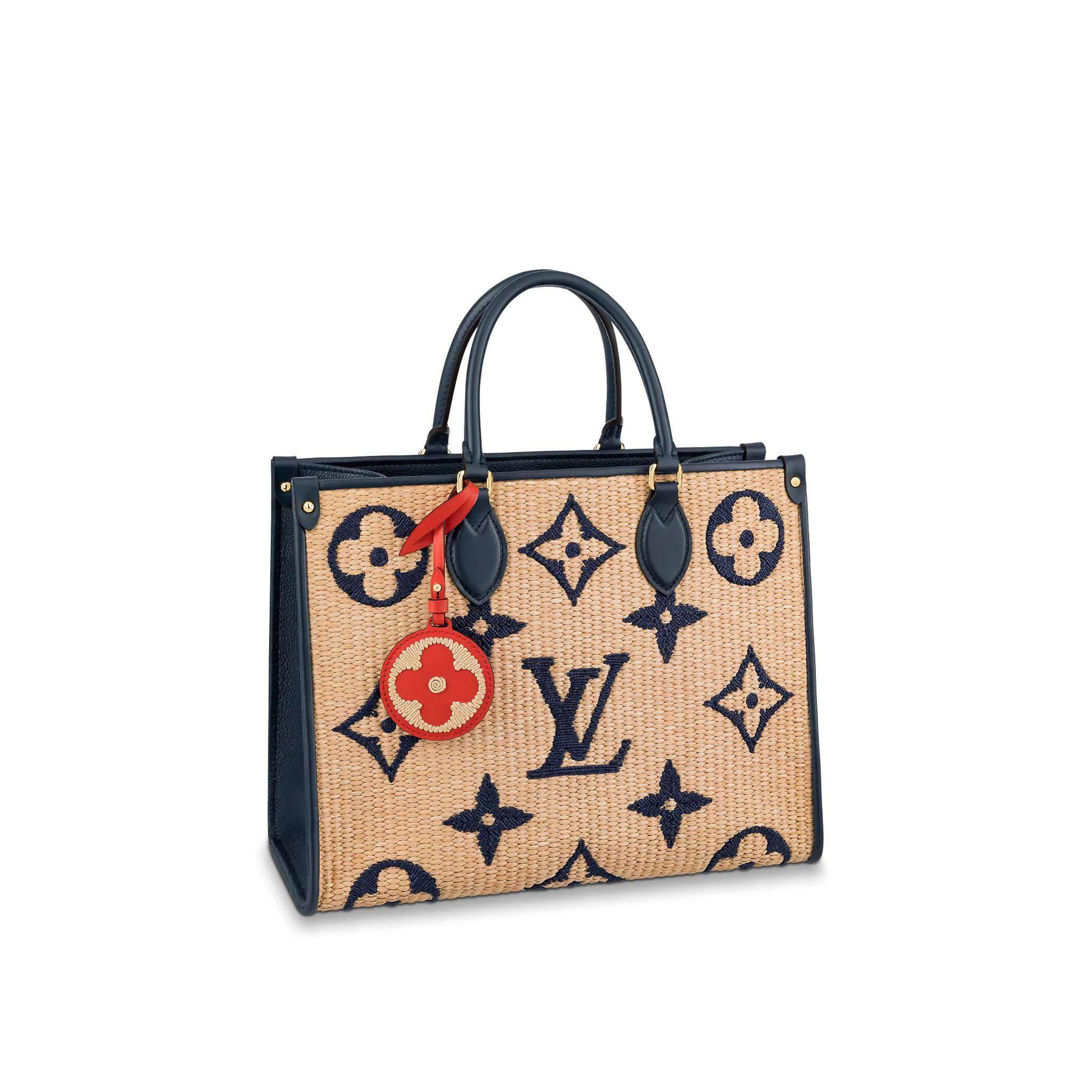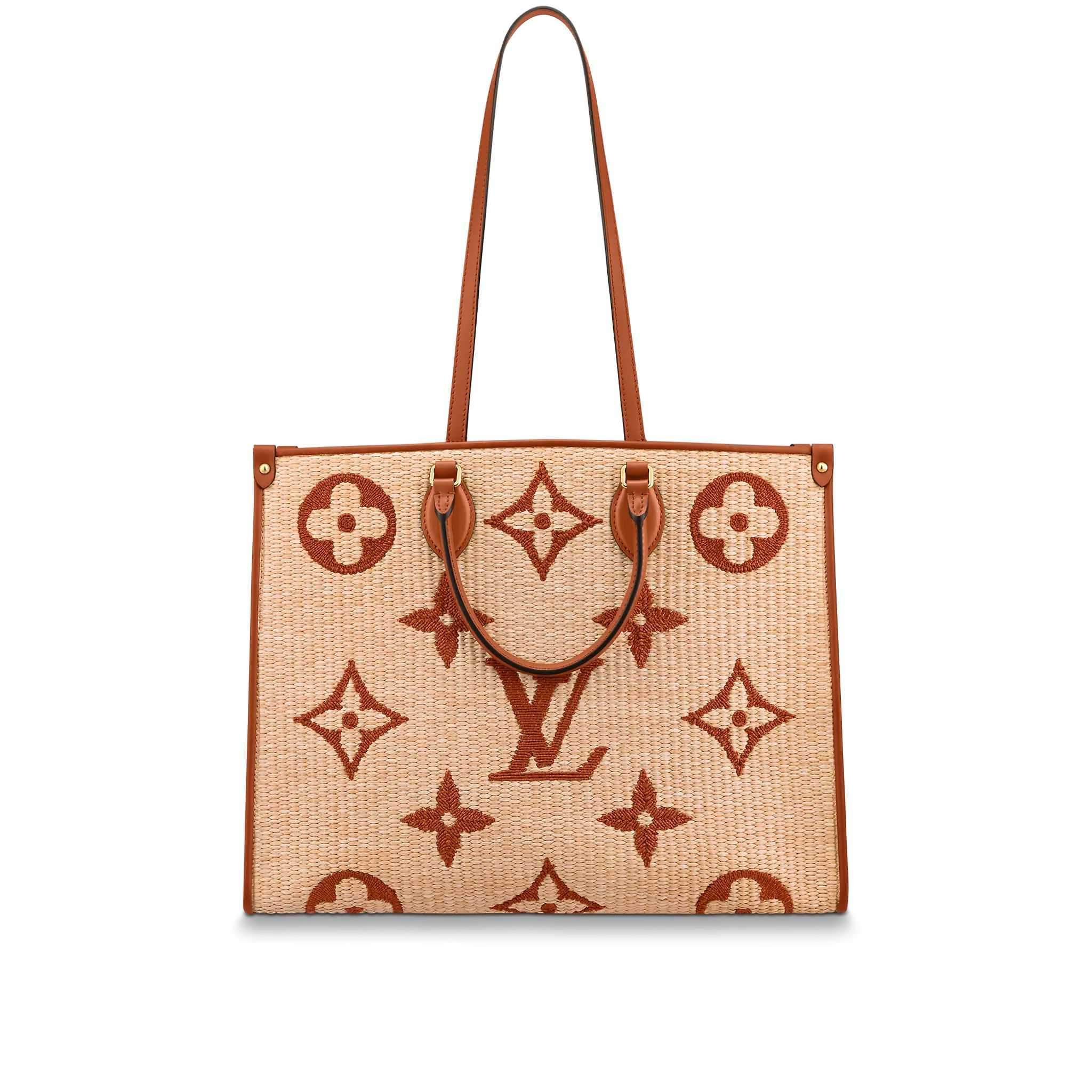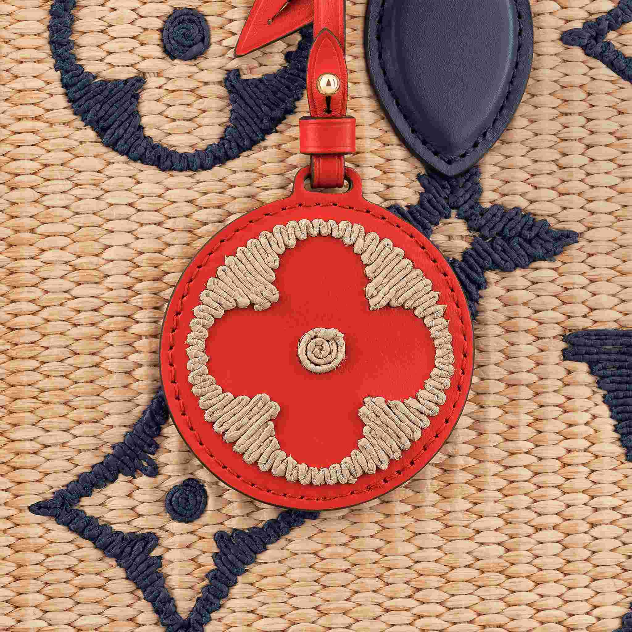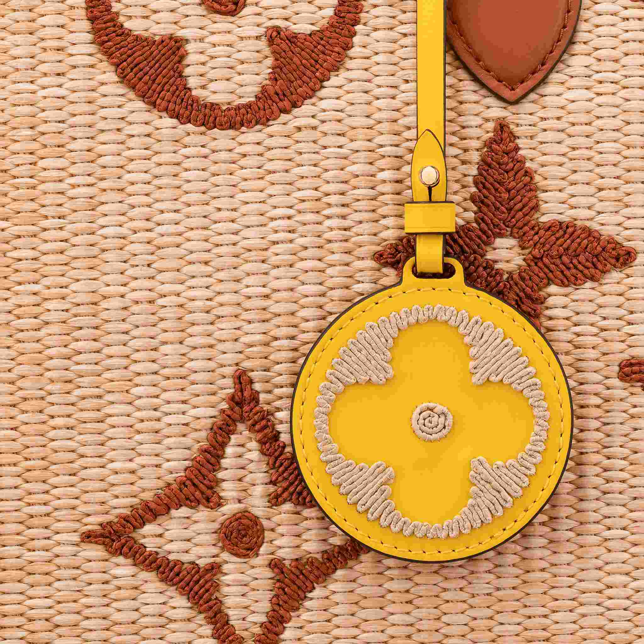 モノグラム・ラフィア テキスタイルを使用し、ハンドル、ショルダーストラップ、マチをレザーで仕上げた「オンザゴー GM」。編み込んだラフィア(ヤシ)を想わせる素材と洗練されたモノグラム・ジャイアント パターンの刺繍が、カジュアルかつナチュラルな雰囲気を演出します。コントラストカラーで表現した、エクスクルーシブなモノグラム・フラワーのチャームも魅力です。