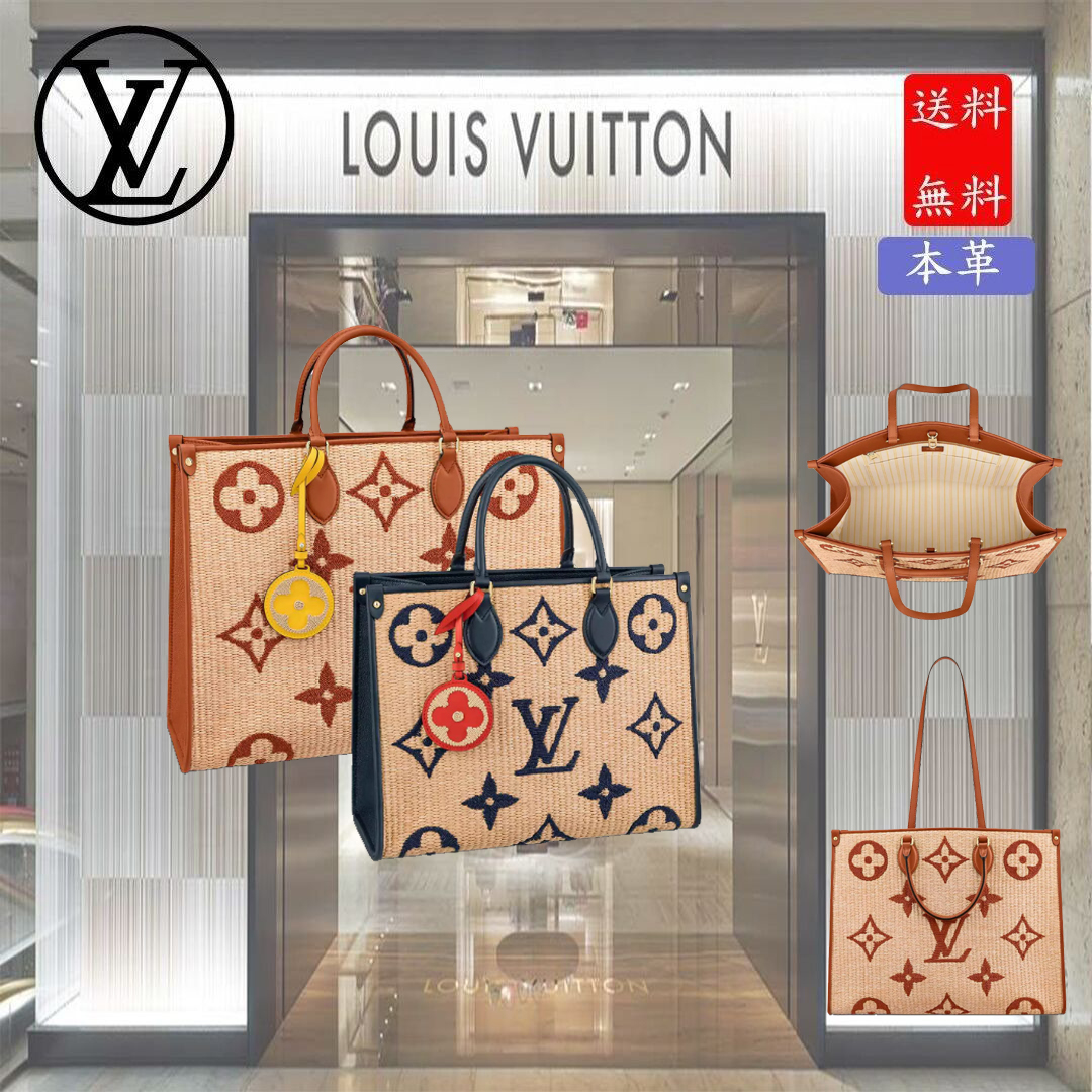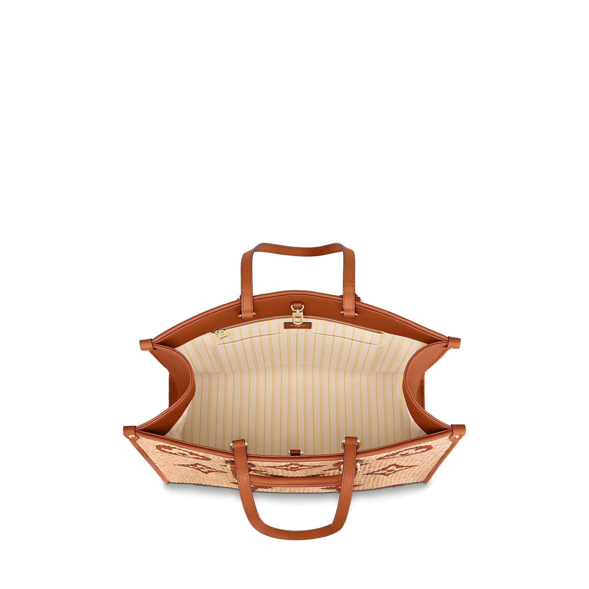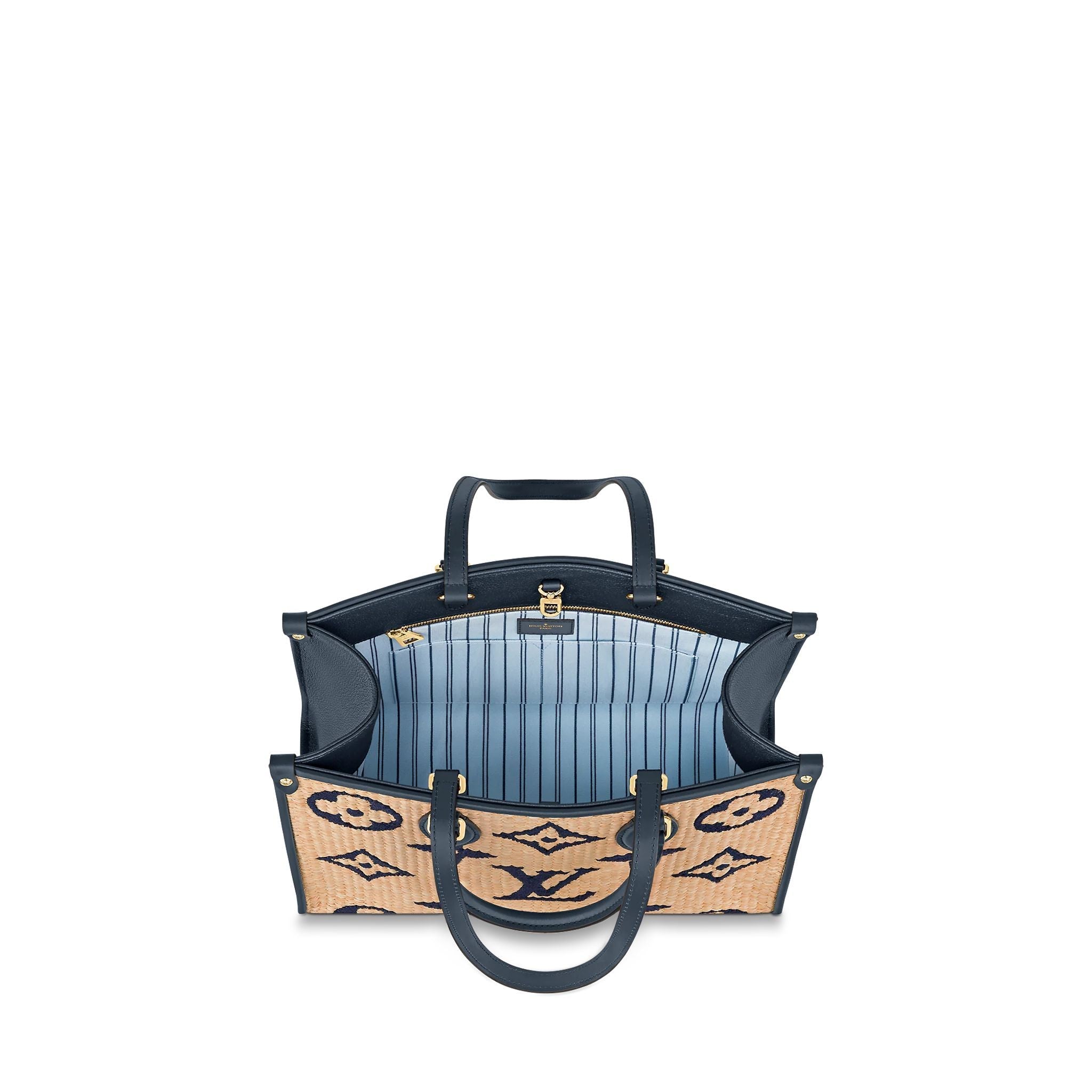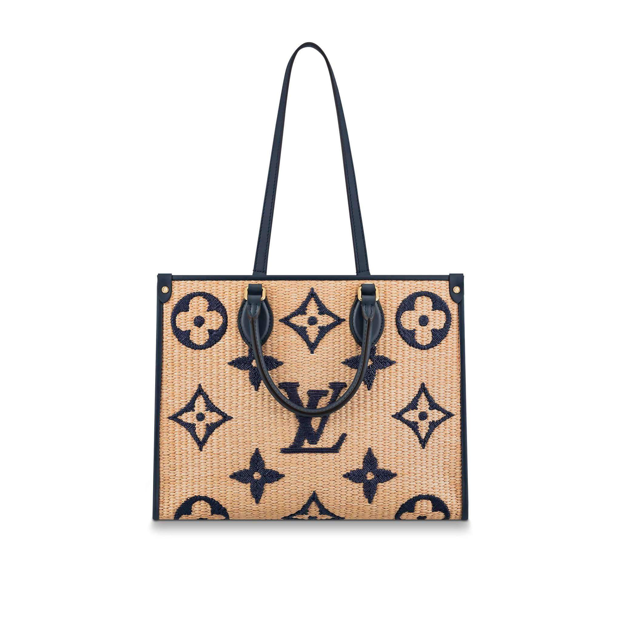 モノグラム・ラフィア テキスタイルを使用し、ハンドル、ショルダーストラップ、マチをレザーで仕上げた「オンザゴー GM」。編み込んだラフィア(ヤシ)を想わせる素材と洗練されたモノグラム・ジャイアント パターンの刺繍が、カジュアルかつナチュラルな雰囲気を演出します。コントラストカラーで表現した、エクスクルーシブなモノグラム・フラワーのチャームも魅力です。