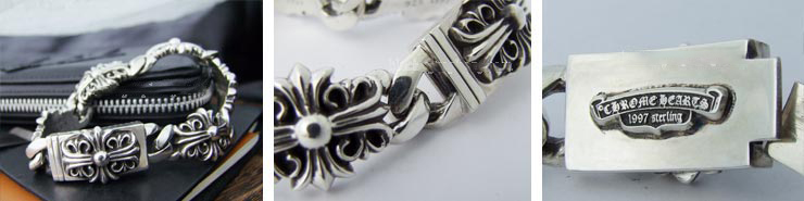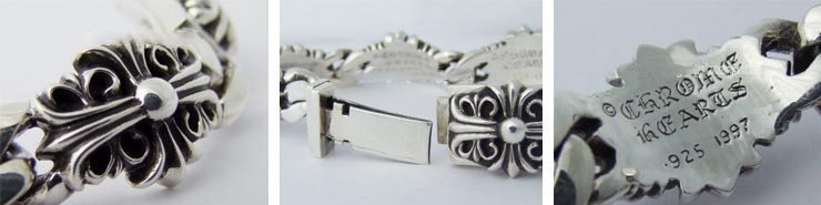リンク一つ一つの裏にCHROME HEARTSのロゴが彫り込まれいて、留め具のプレートの裏には、立体的なCHROMEHEARTSスクロールラベルロゴが彫り込まれ、手首のわずかな隙間からもクロムハーツのこだわりが見え隠れします。