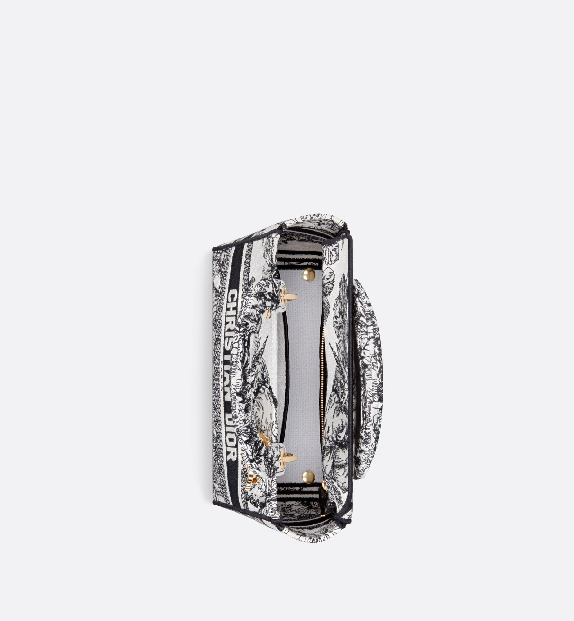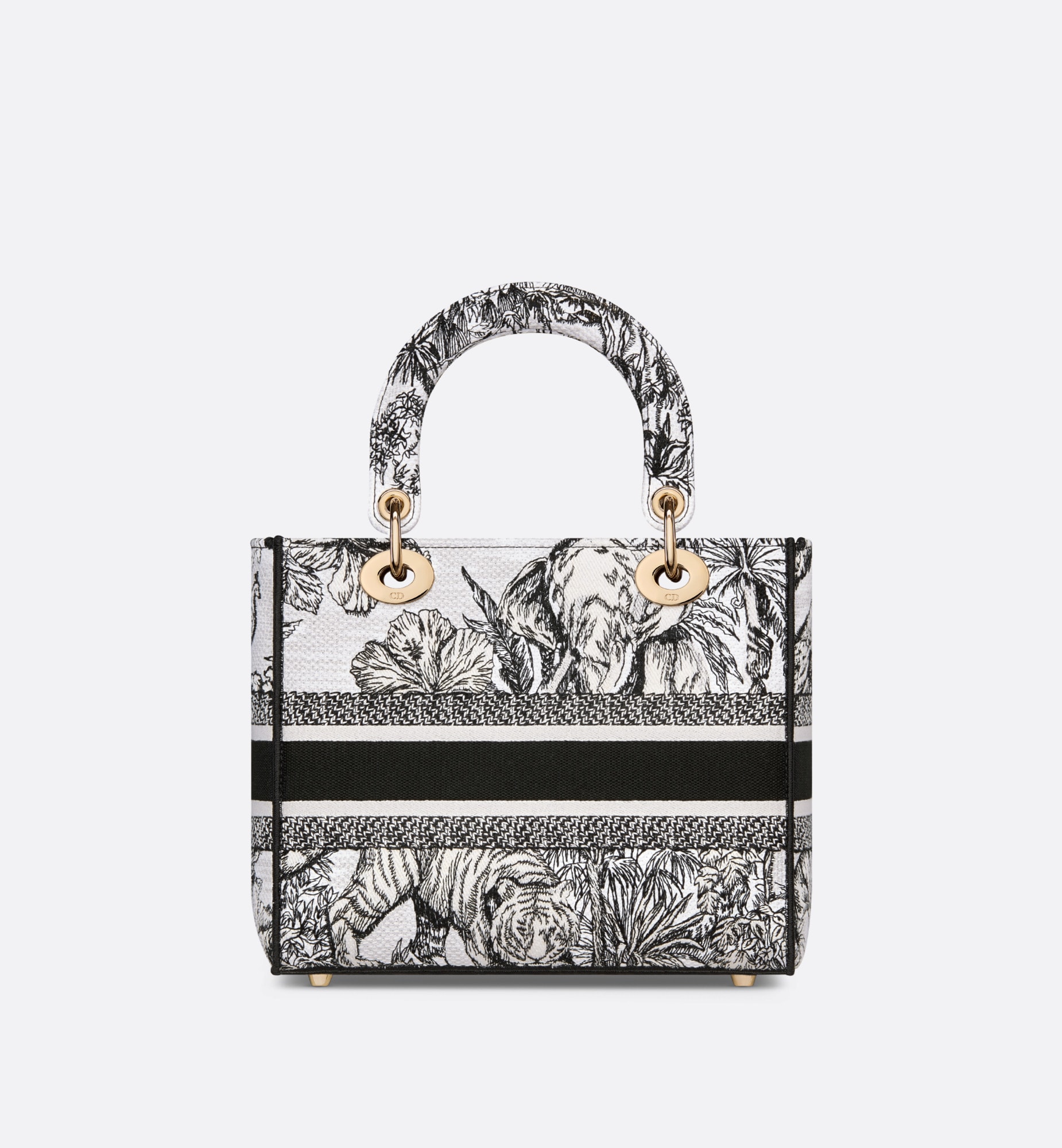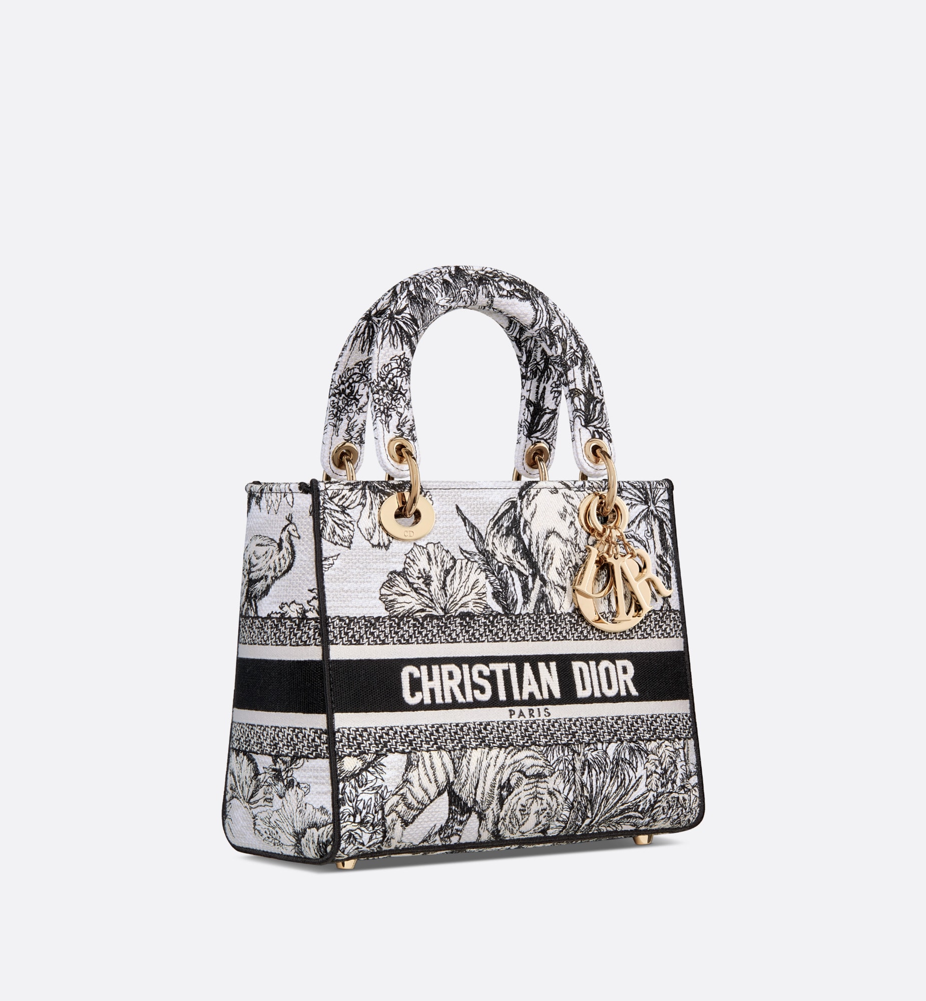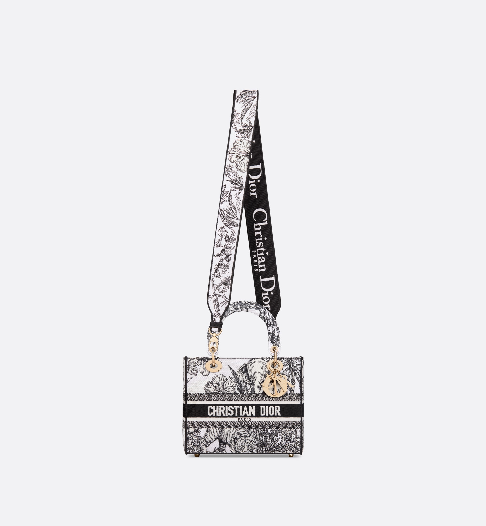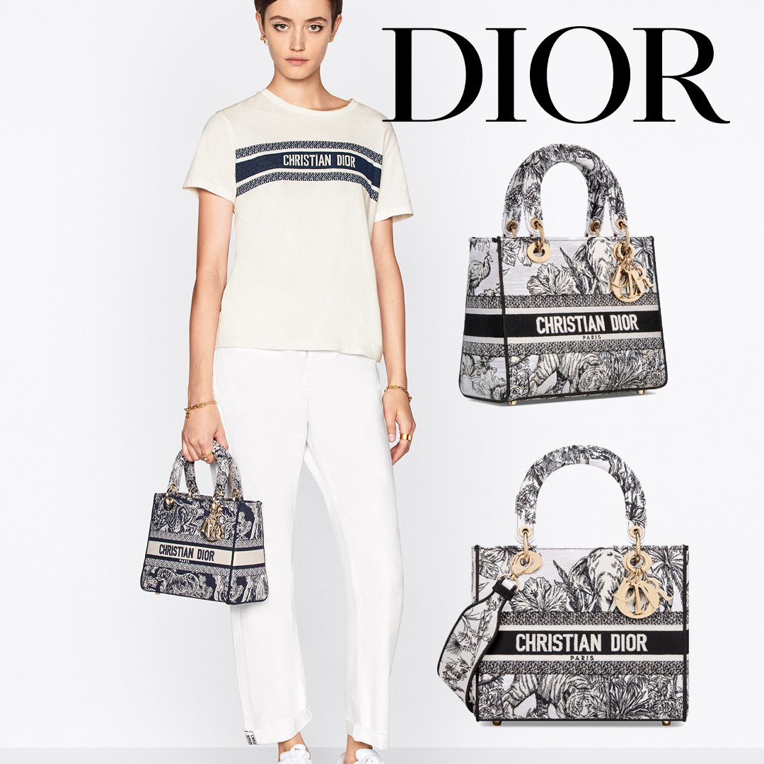 メゾンのビジョンであるエレガンスと美を体現する 「Lady D-Lite (レディ D-ライト)」バッグ。ムッシュ ディオールのアイコニックなパターンをインドの動植物と融合させた ピエトロ・ルッフォによる「トワル ドゥ ジュイ ヴォヤージュ」モチーフをホワイト & ブラックで全面に刺繍し タイムレスで洗練されたアイテムに仕上げました。ペールゴールドトーンのメタル製D.I.O.R.チャームがきらめきを添え シルエットの美しさを引き立てます。幅広でリバーシブルの刺繍入りショルダーストラップは取り外すことができ ハンドバッグとしてはもちろんクロスボディバッグとしてもお使いいただけるミディアムサイズのモデルです。