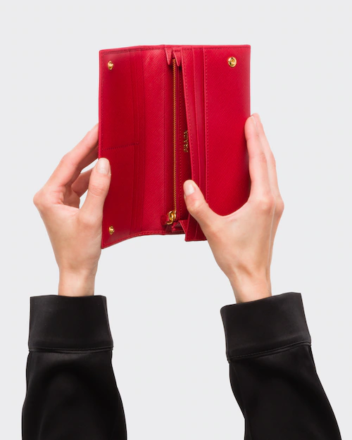 プラダのトライアングルロゴをあしらった、「サフィアーノ」レザー(牛革)のフラップ付の財布。スナップ開閉式で、内側に複数のポケットと、取り外し可能なチェーン付バッジホルダーを備えたアイテム。