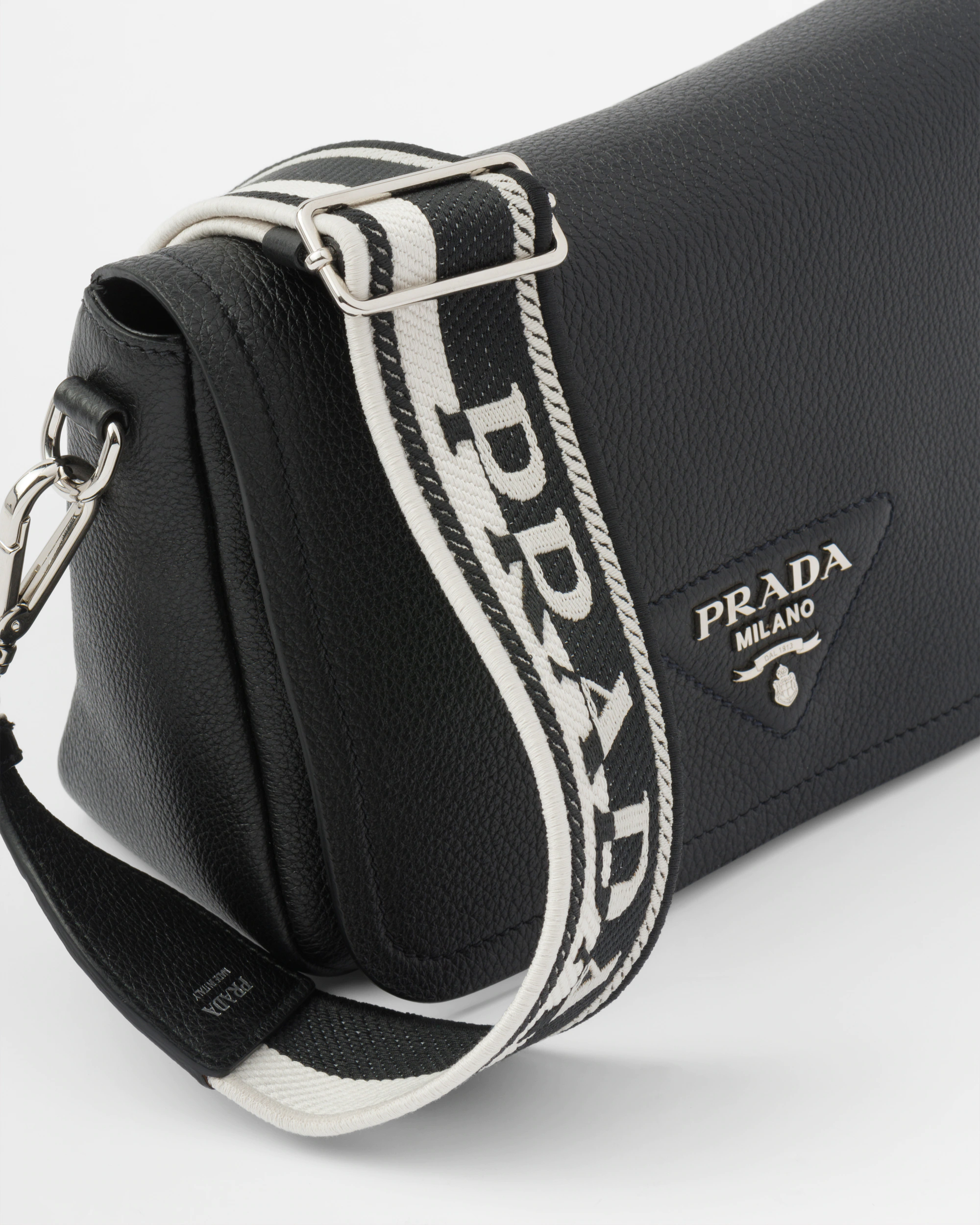 サイドにソフトなプリーツ入りのモダンなシルエット、フラップにゴールドのレタリングロゴをあしらった小ぶりなレザーバッグ。コントラストカラーのロゴ刺繍入り織テープの調節可能なショルダーストラップ付で、クロスボディバッグとしてもショルダーバッグとしても使用できる使い勝手に優れたバッグ。