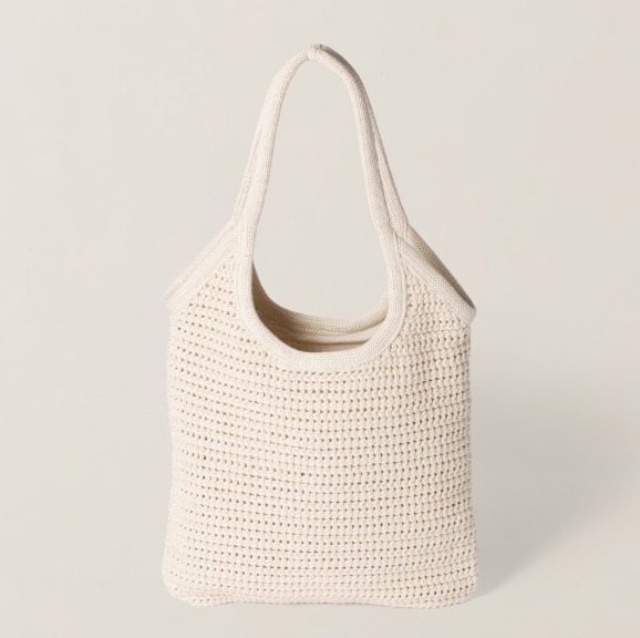 ラフィア風の加工を施した糸で編んだ夏らしいモチーフが、洗練されたフォルムを引き立てる機能的なデザインのアイビーバッグ。