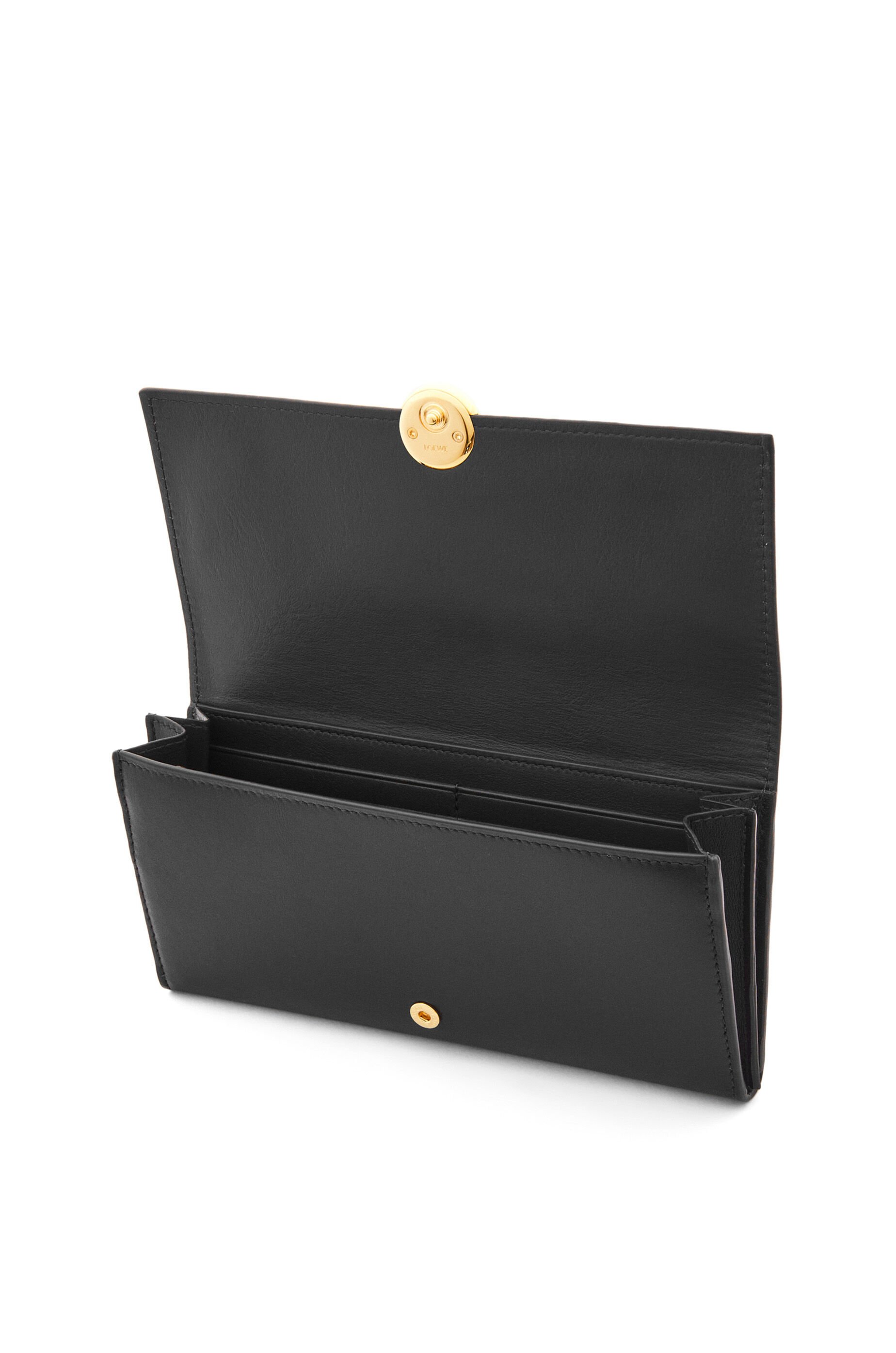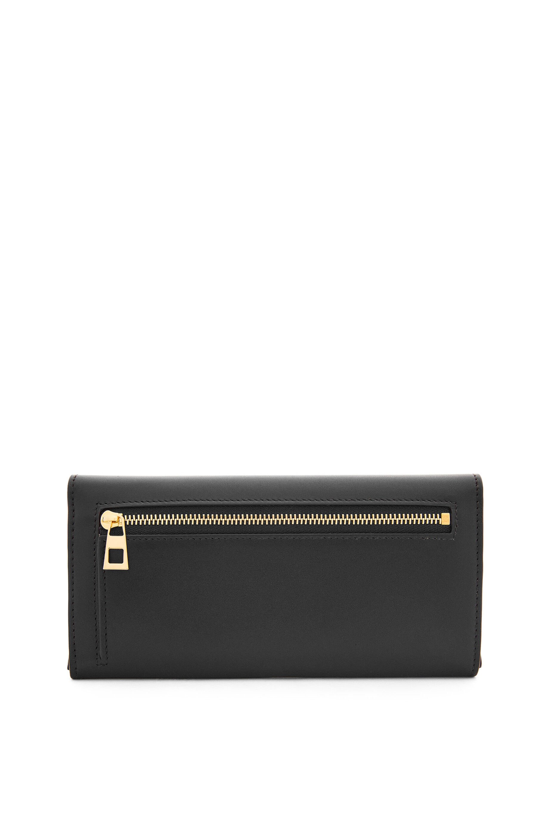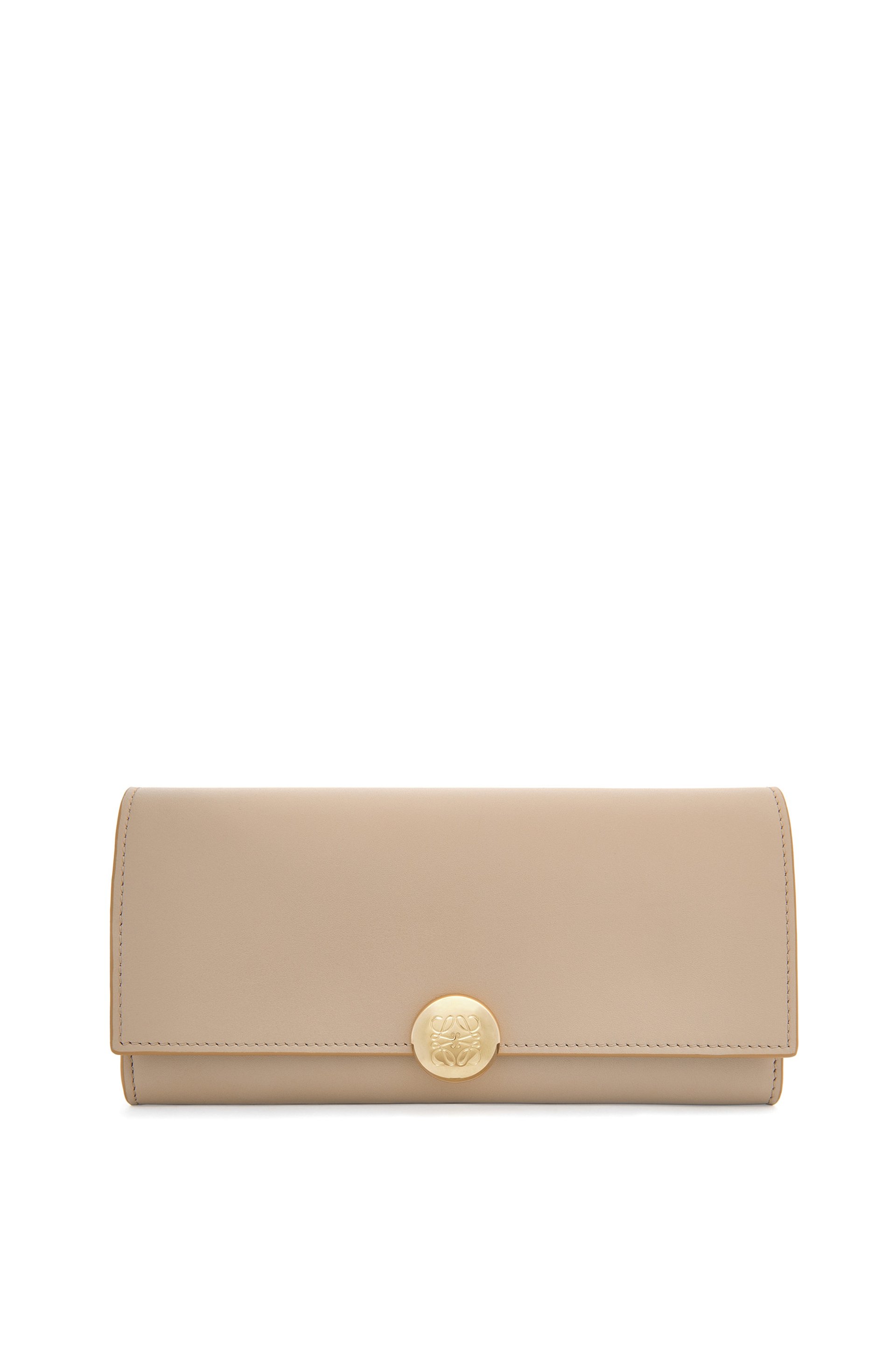 シャイニーナパカーフスキンを採用したコンティネンタルウォレット。シグネチャーのアナグラムぺブルのクロージャーがあしらわれています