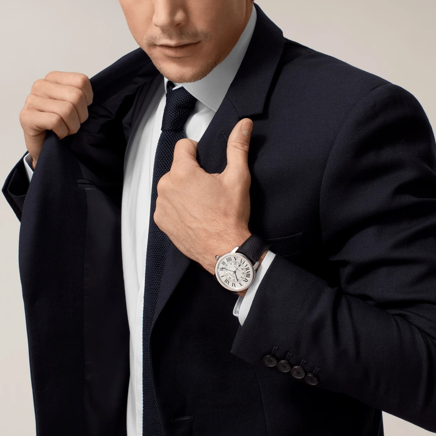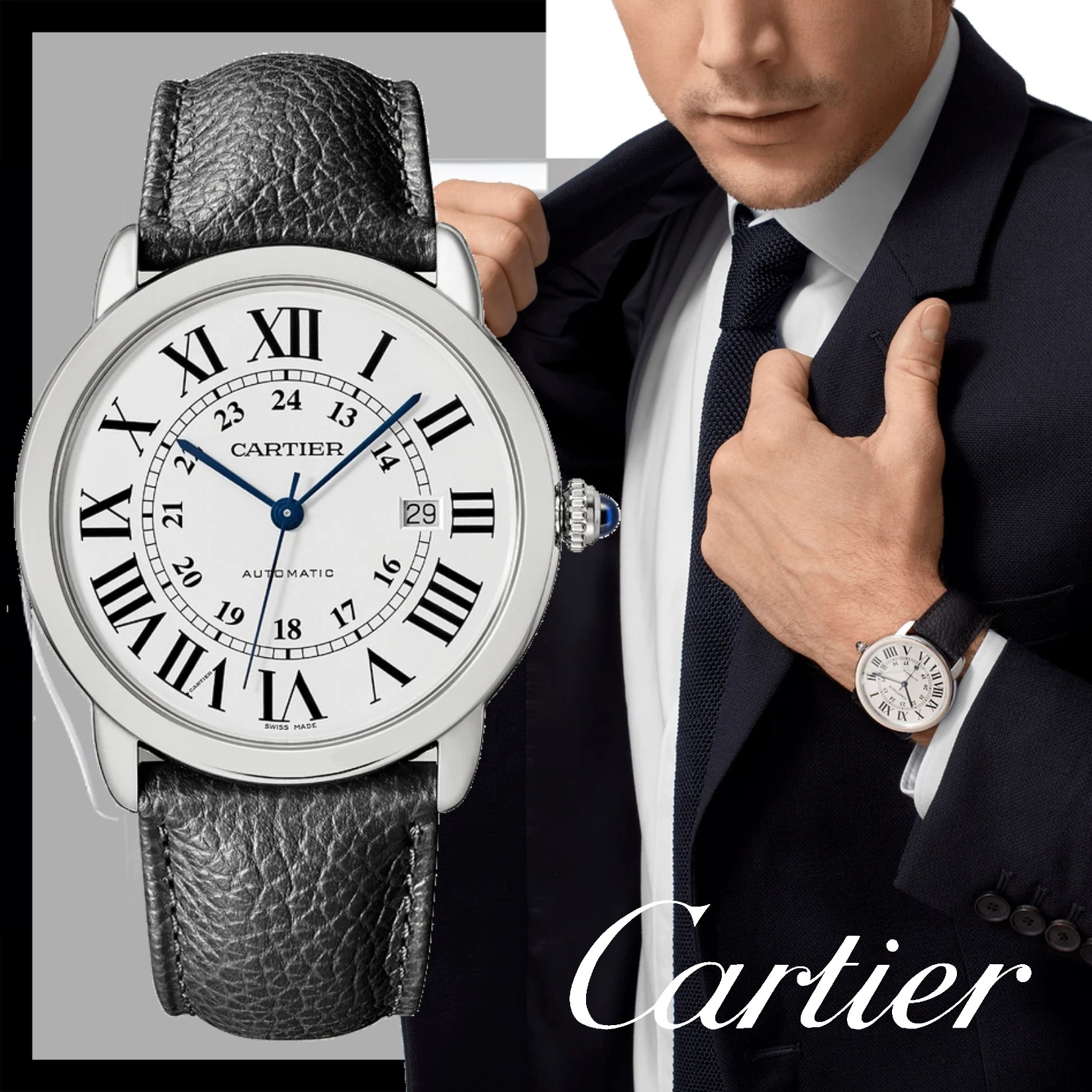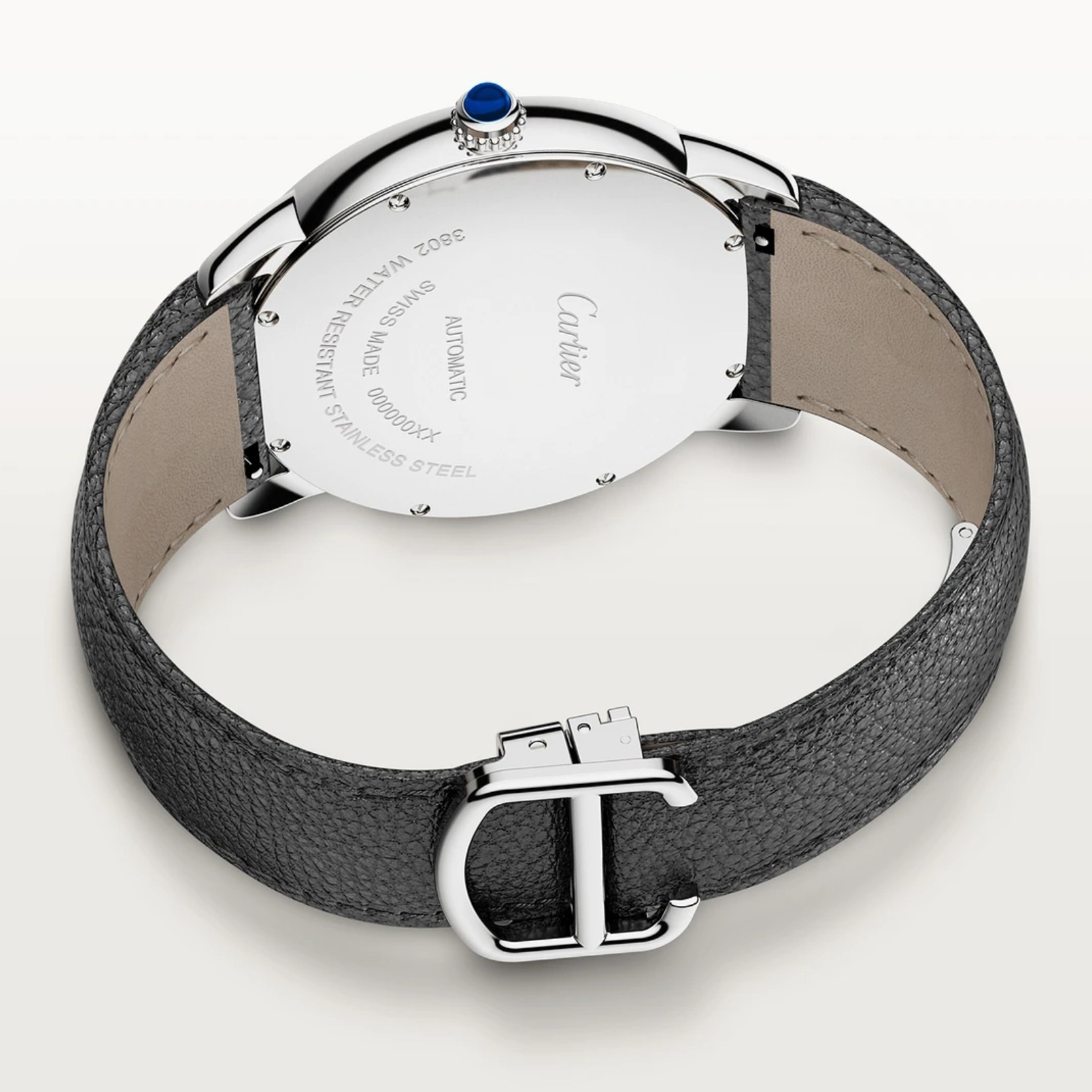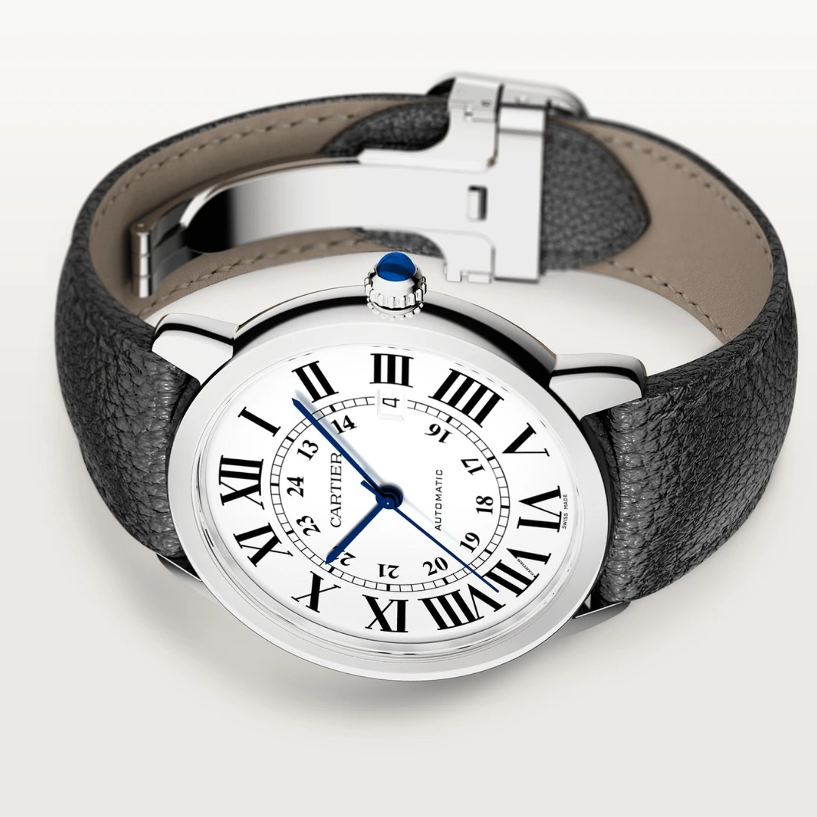 ロンド ソロ ドゥ カルティエ ウォッチ、42 mm、自動巻きメカニカルムーブメント。スティール製ケース、パール状の飾り付きリューズにシンセティック カボションシェイプ スピネル、シルバー オパライン ダイアル、ブルースティール製剣型針、サファイア クリスタル、付替可能ブラック グレインド カーフスキン ストラップ、スティール製ダブルアジャスタブル デプロワイヤント バックル、3時位置にデイト表示。ケースの厚さ:8.36 mm、日常生活防水。