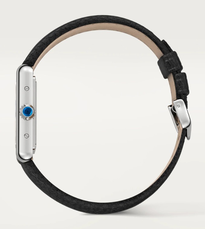 スティール製ケース、パール状の飾り付きリューズにカボションシェイプ シンセティック スピネル、シルバーダイアル、ブルースティール製剣型針、グレイン仕上げブラックカーフスキンストラップ、スティール製アルディロンバックル。