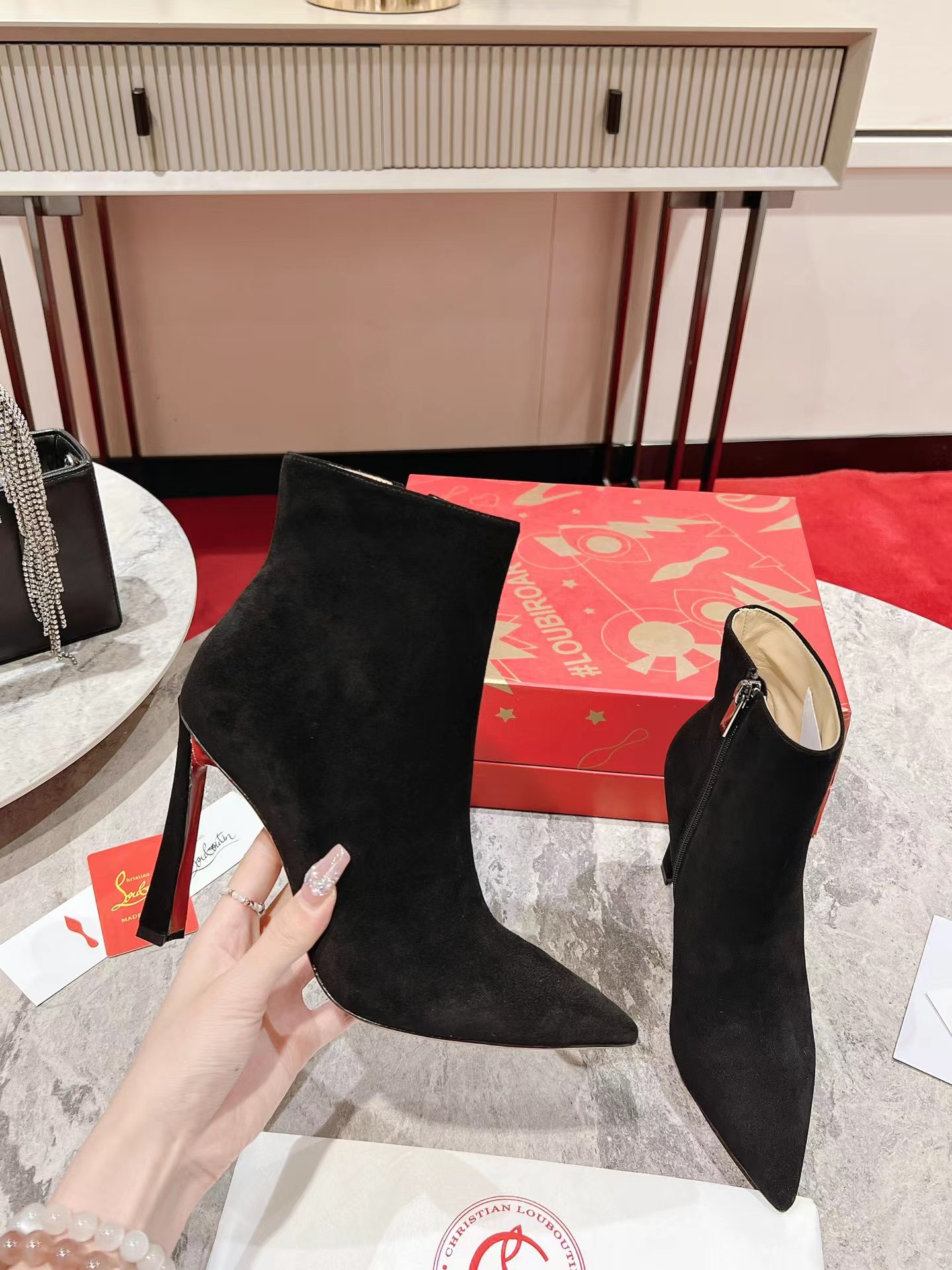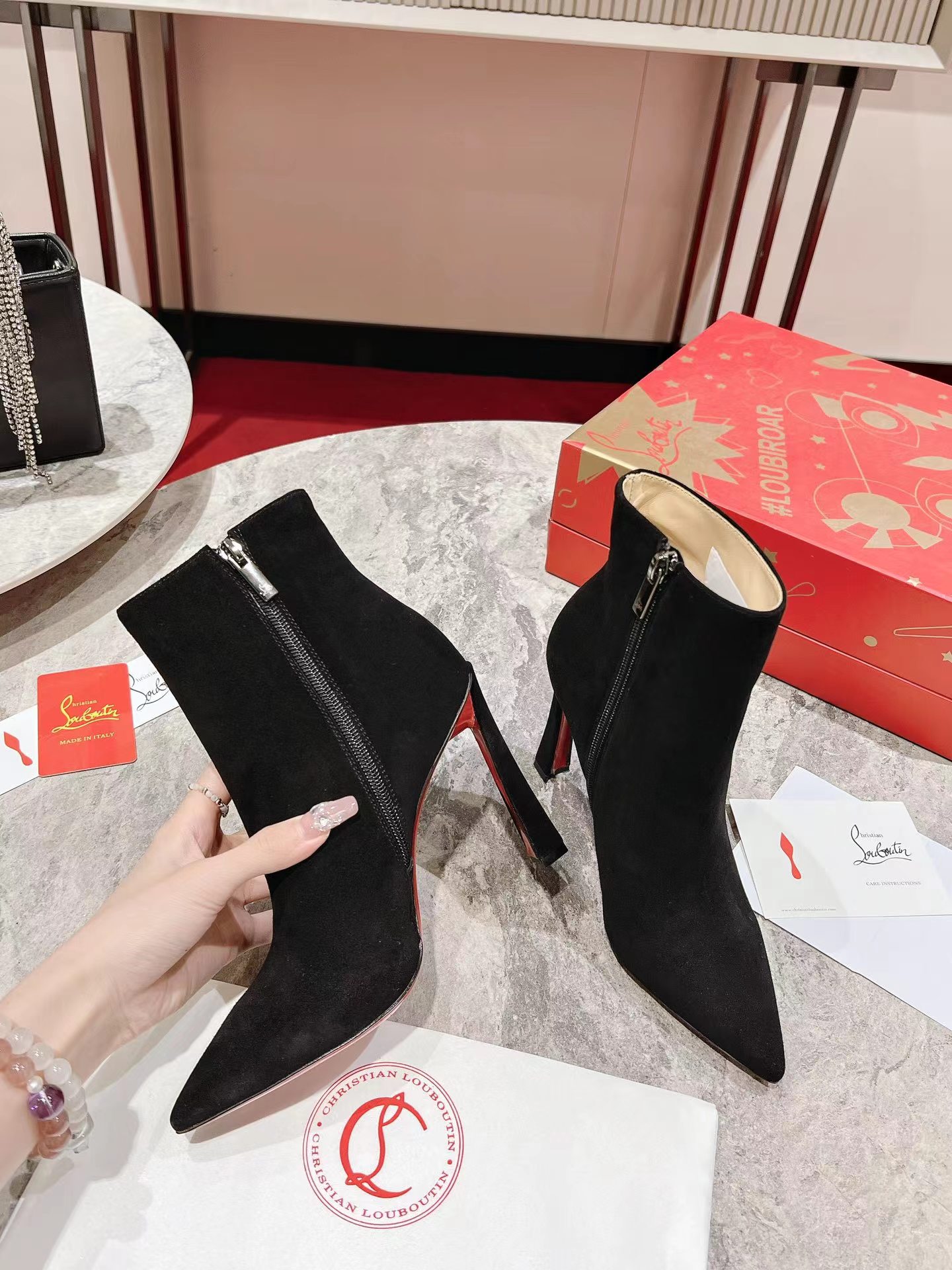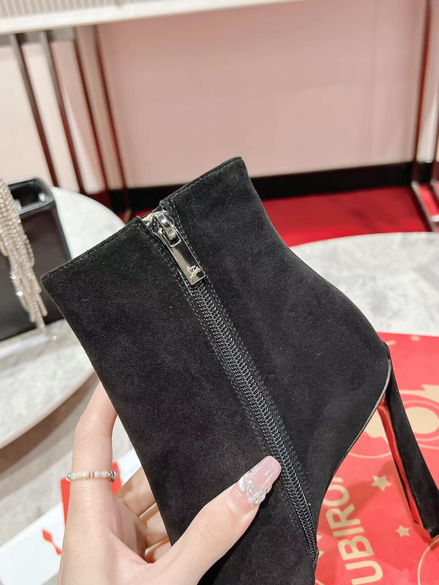 A thoroughly modern piece, the Condora Booty features Maison Christian Louboutin's architectural Plume heel, which reveals a flash of Loubi red. Set on a 100 mm heel, the sumptuous veau velours suede upper, features a straight cut across the ankle. This booty features a timeless stiletto boot design, with a zip closure on the inside and pointed toe.