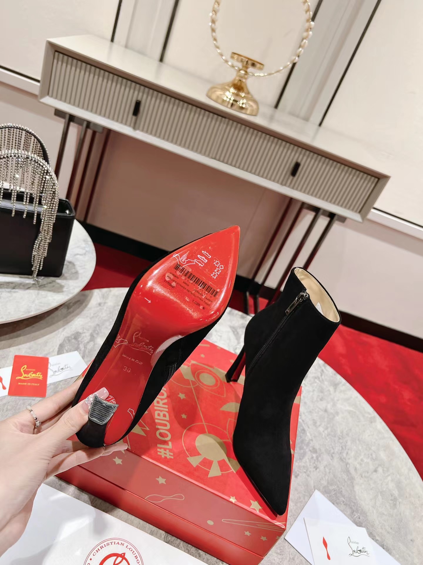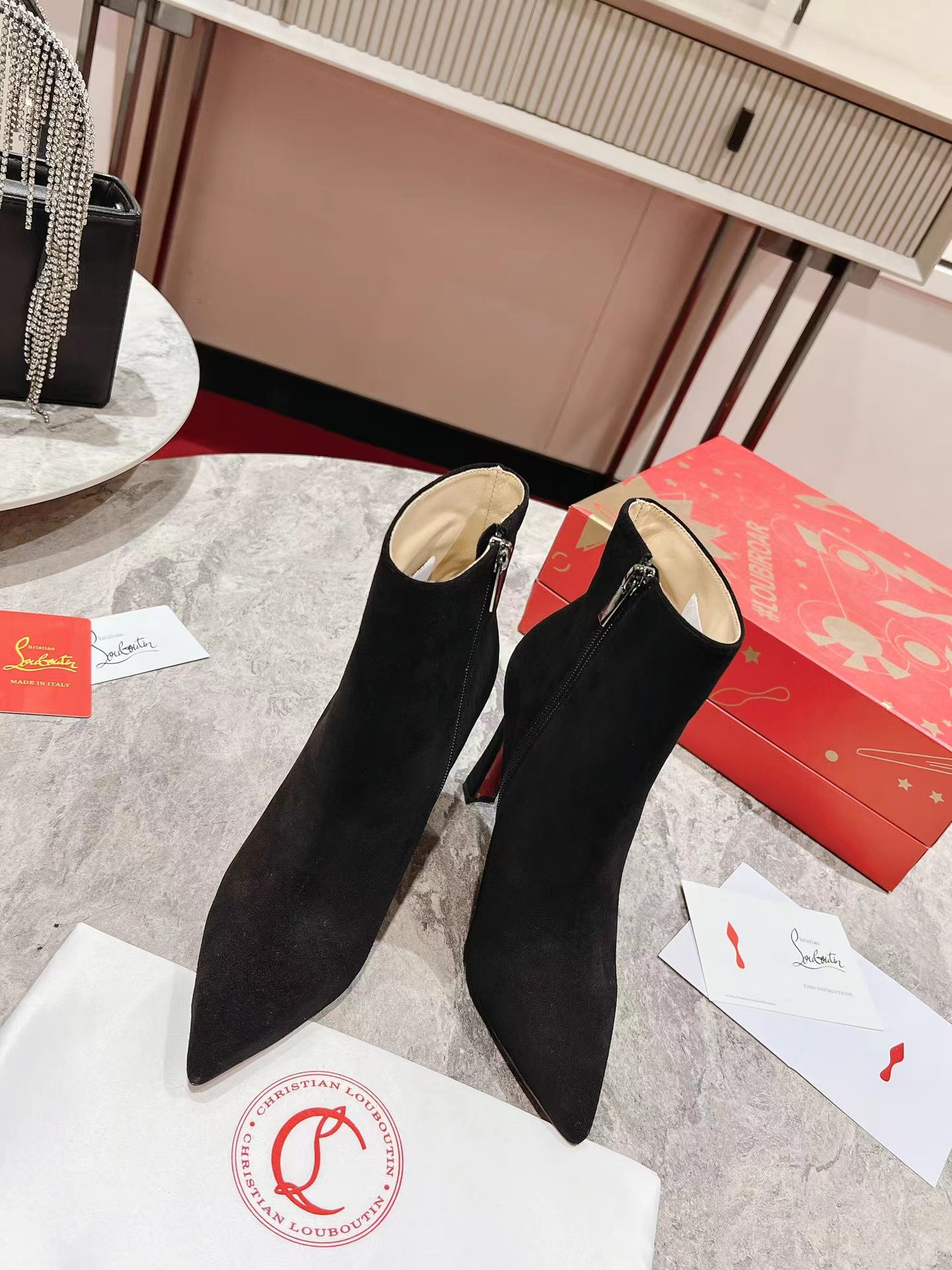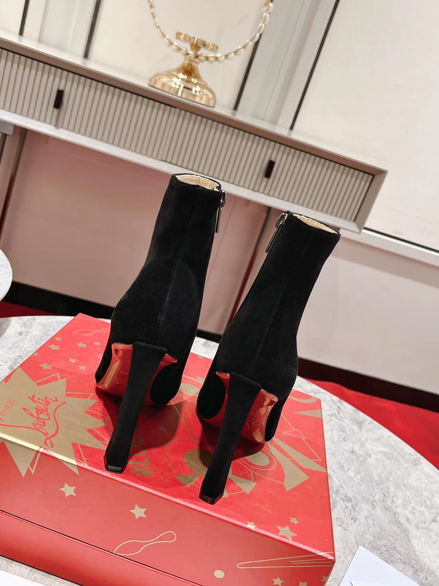 A thoroughly modern piece, the Condora Booty features Maison Christian Louboutin's architectural Plume heel, which reveals a flash of Loubi red. Set on a 100 mm heel, the sumptuous veau velours suede upper, features a straight cut across the ankle. This booty features a timeless stiletto boot design, with a zip closure on the inside and pointed toe.