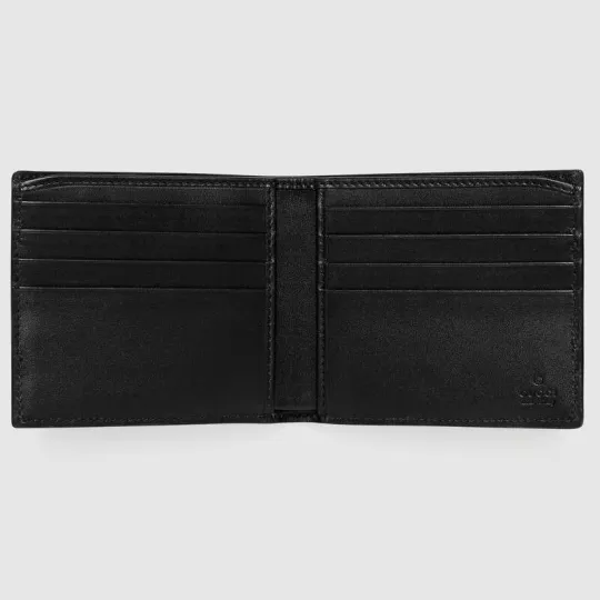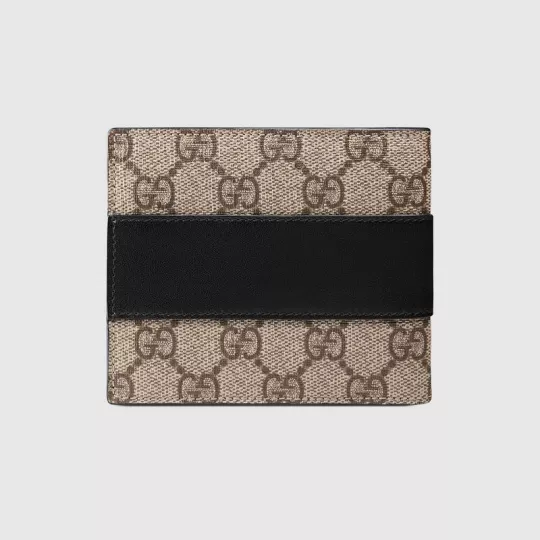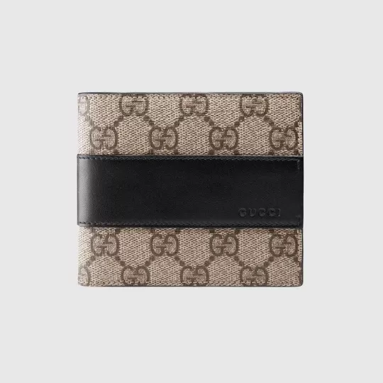 二つ折り財布は グッチのエンボス加工された革のディテールを備えたGGSupremeキャンバスから作られています。
