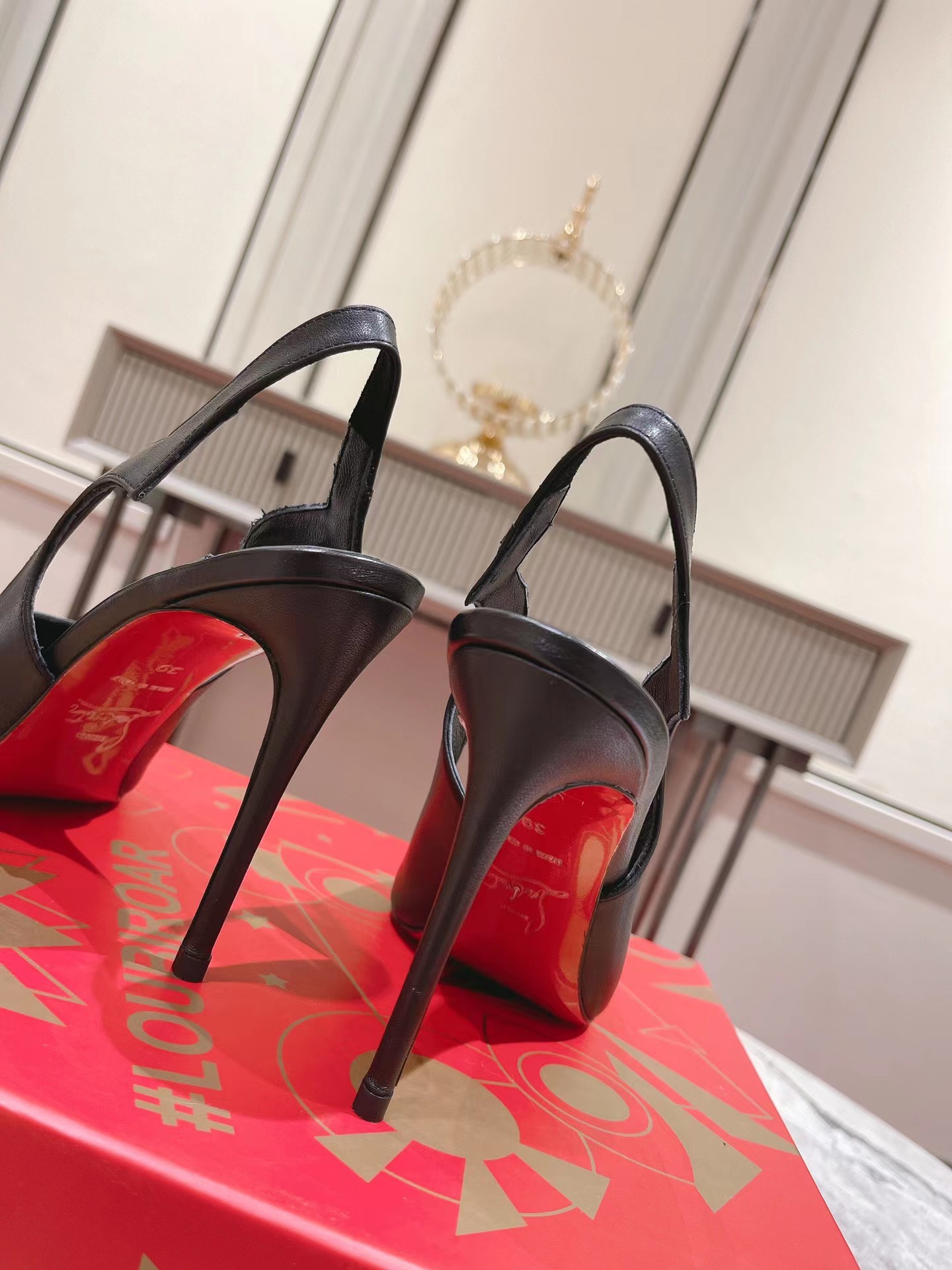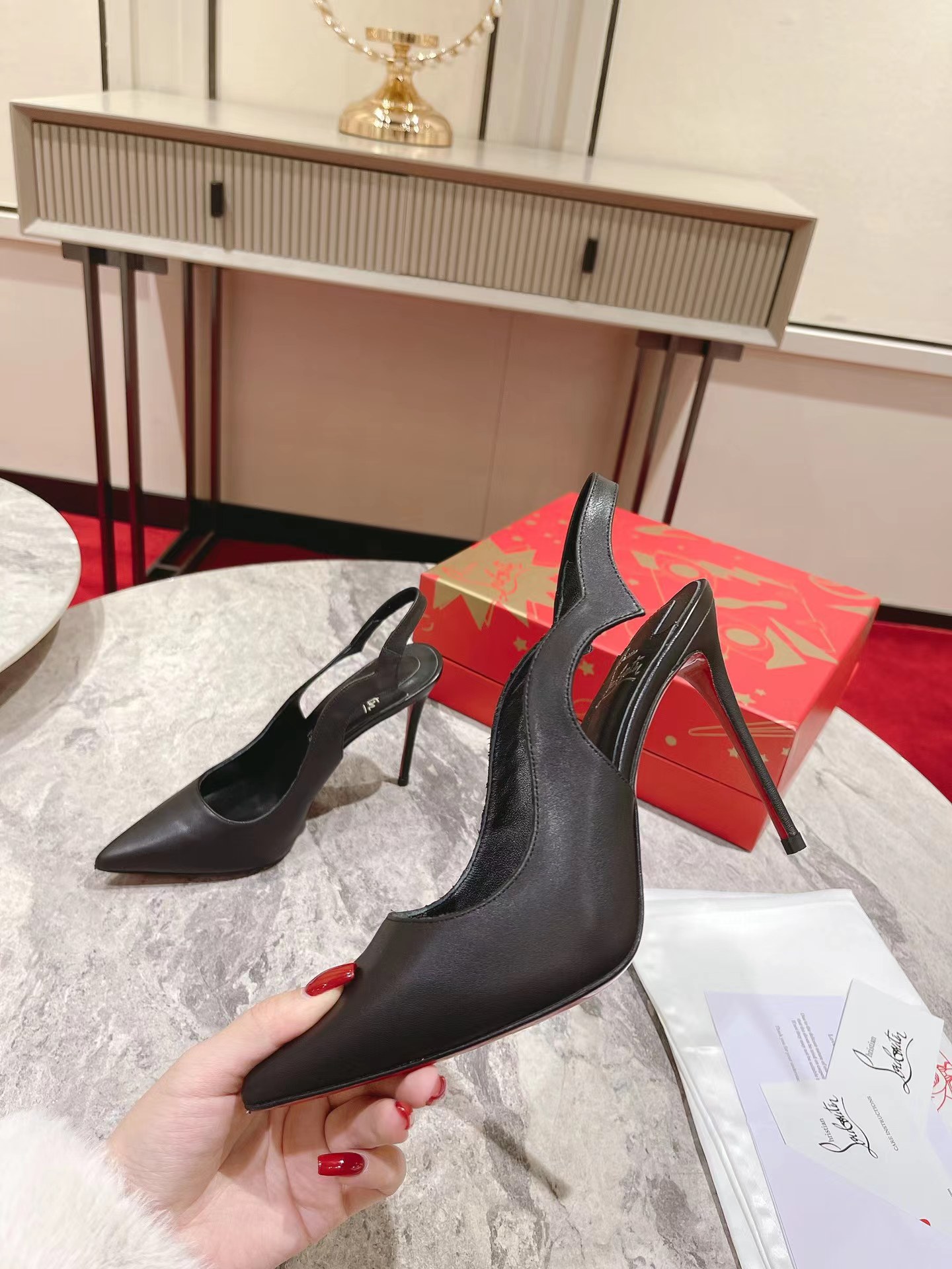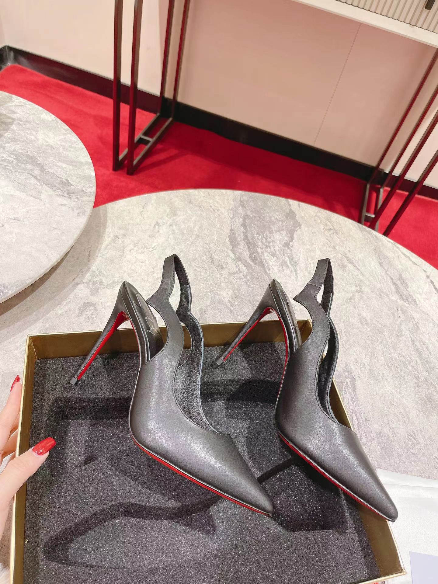 クリスチャン ルブタンの新作、Hot Chick Sling。V字型のノッチを入れたアンクルストラップが、大胆なカッティングを引き立てるデザインです。全体にはブラックのパテントカーフレザーを使用し、100㎜のスティレットヒールで仕上げました。洗練されたモデルを強調するオープントウとスレンダーなラインが、エレガントで都会的な魅力を放ちます。