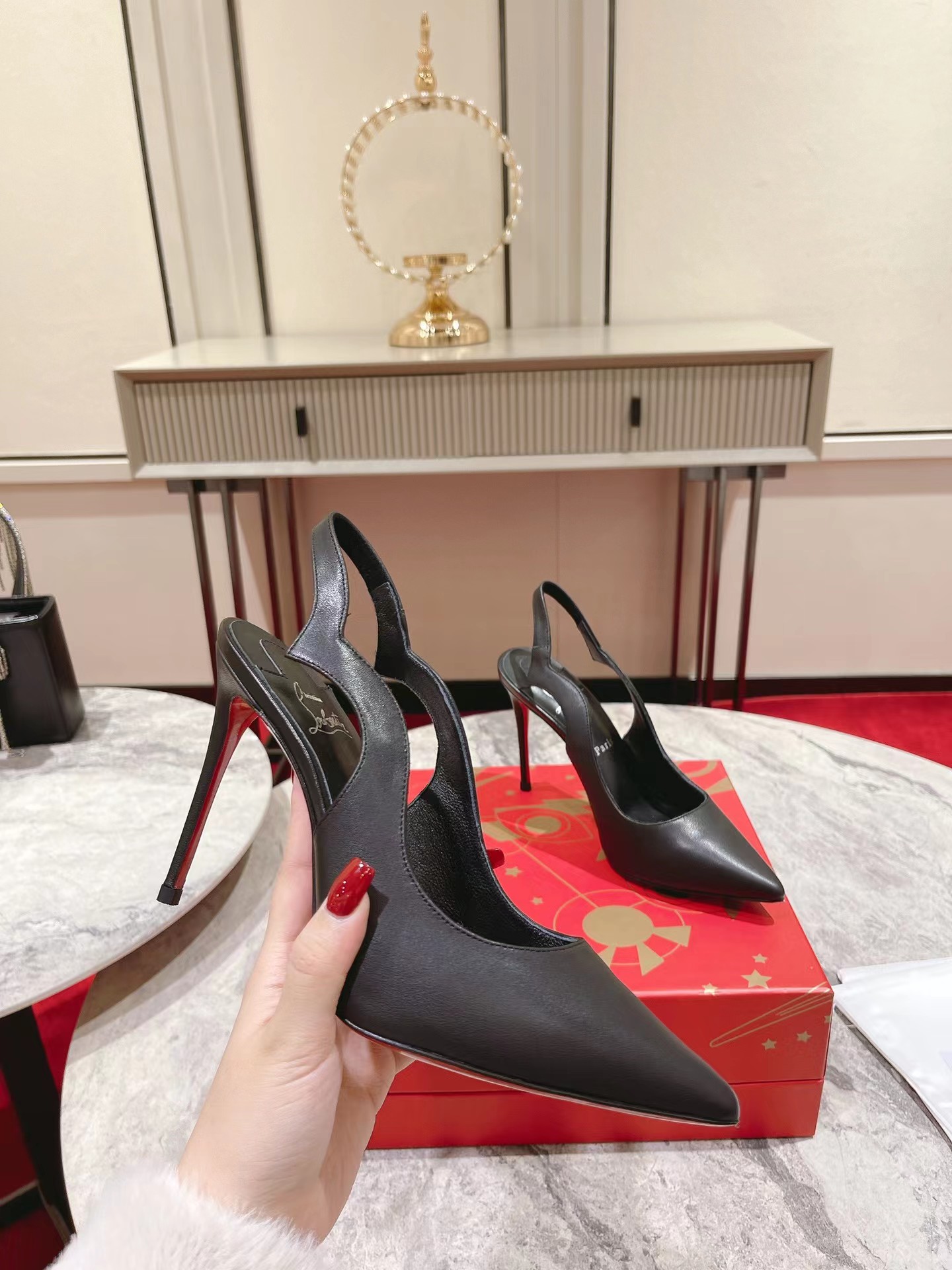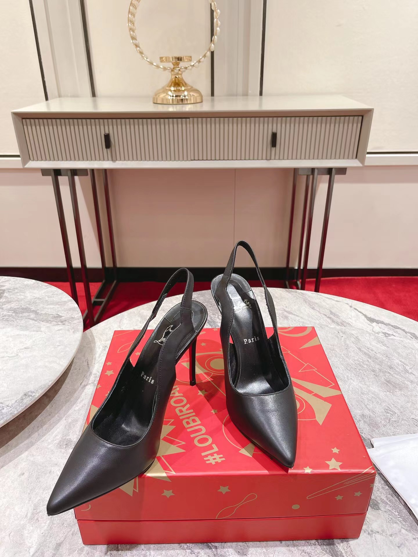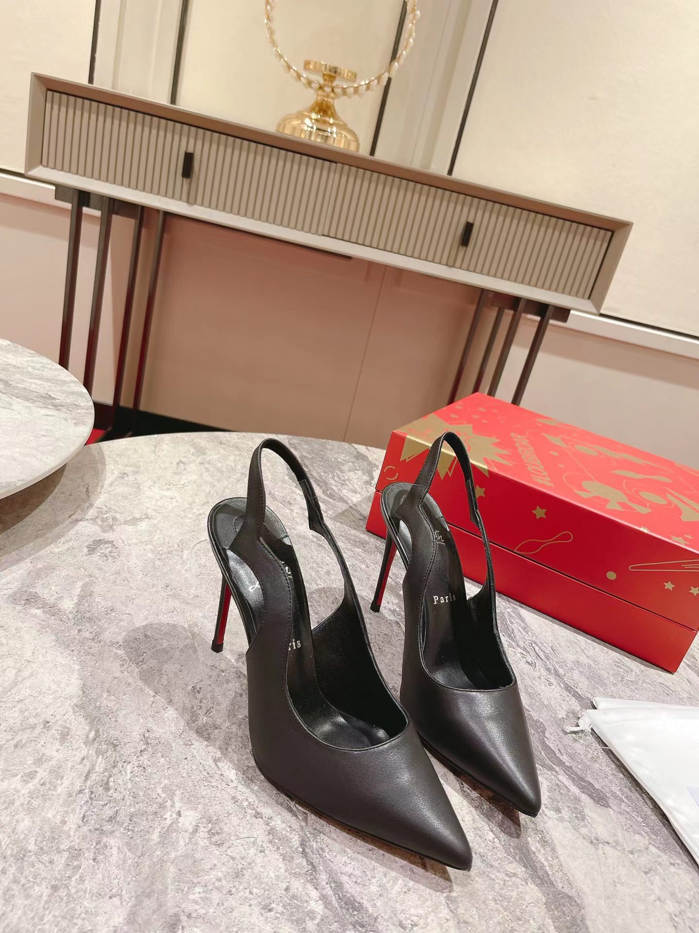 クリスチャン ルブタンの新作、Hot Chick Sling。V字型のノッチを入れたアンクルストラップが、大胆なカッティングを引き立てるデザインです。全体にはブラックのパテントカーフレザーを使用し、100㎜のスティレットヒールで仕上げました。洗練されたモデルを強調するオープントウとスレンダーなラインが、エレガントで都会的な魅力を放ちます。