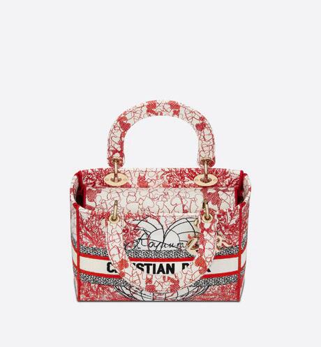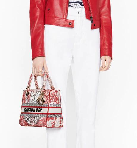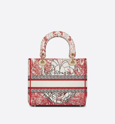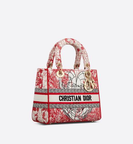 「Dioramour (ディオールアムール)」カプセルコレクションより、クラシックなエレガンスとディオールのモダニティを併せ持つ「Lady D-Lite(レディ D-ライト)」バッグ。アーティスト ピエトロ・ルッフォに着想を得た、レッドとホワイトの「D-Royaume d'Amour (D-ロワイヨム ダムール)」モチーフの刺繍を全面にあしらいました。フロントに“クリスチャン・ディオール”シグネチャーをあしらい、ボリューム感のあるペールゴールドトーン メタルの“D.I.O.R.”チャームが魅力的なシルエットを引き立てます。幅広でリバーシブルの刺繍入りショルダーストラップは取り外すことができ、手提げスタイルはもちろん、ショルダーバッグやクロスボディバッグとしてもお使いいただけます。「ディオールアムール」の他のアイテムと組み合わせてもお楽しみいただける、ミディアムサイズのモデルです。