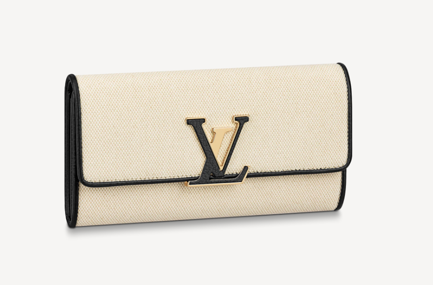 ナチュラルカラーのキャンバスとブラックレザーのトリミングを組み合わせて、洗練された雰囲気に再解釈した「ポルトフォイユ・カプシーヌ」。レザーでカバーした「カプシーヌ」を象徴するLV イニシャルの留め具が魅力です。クラシカルなフラップ付きの財布には、豊富なポケットやコンパートメント、カードスロットが備わっています。