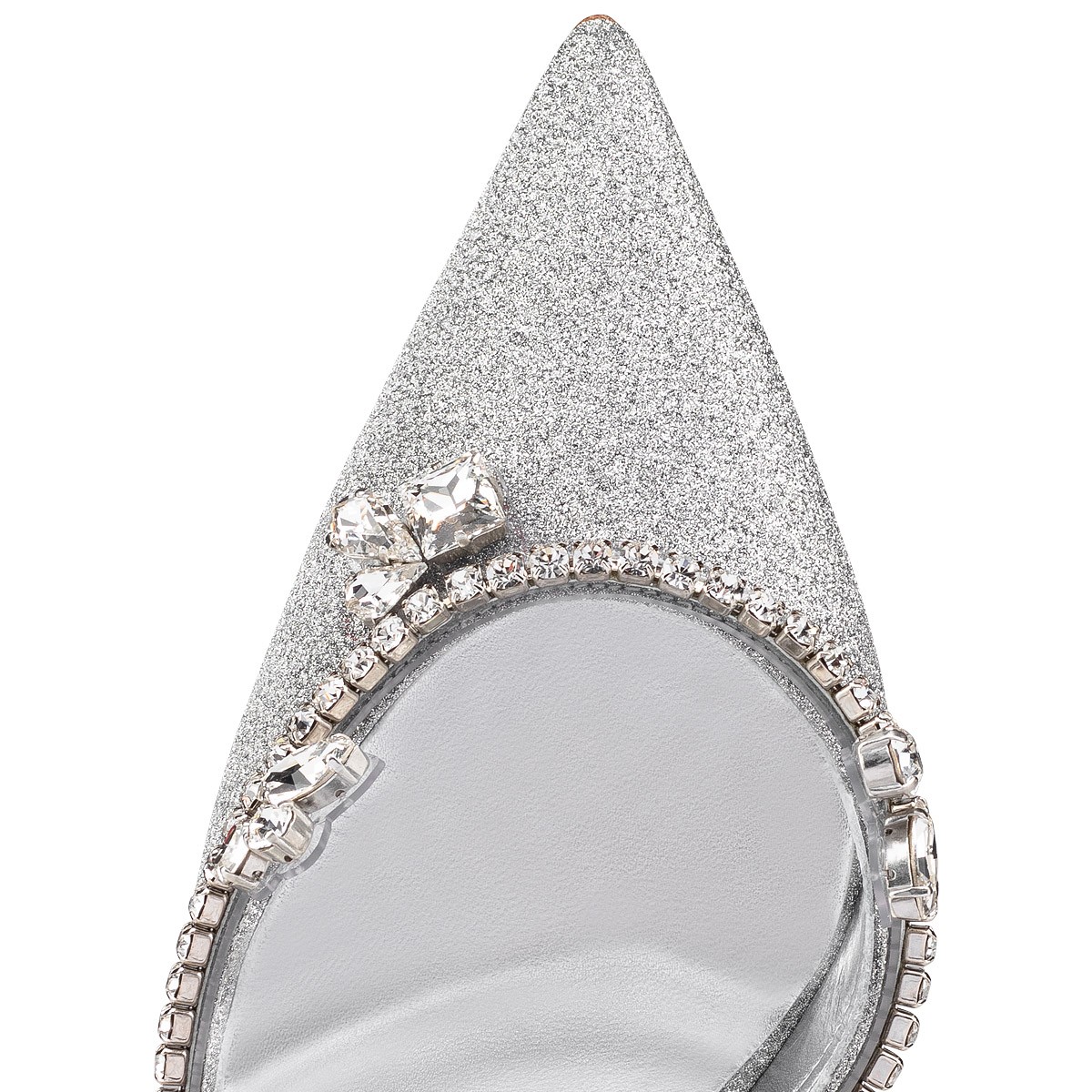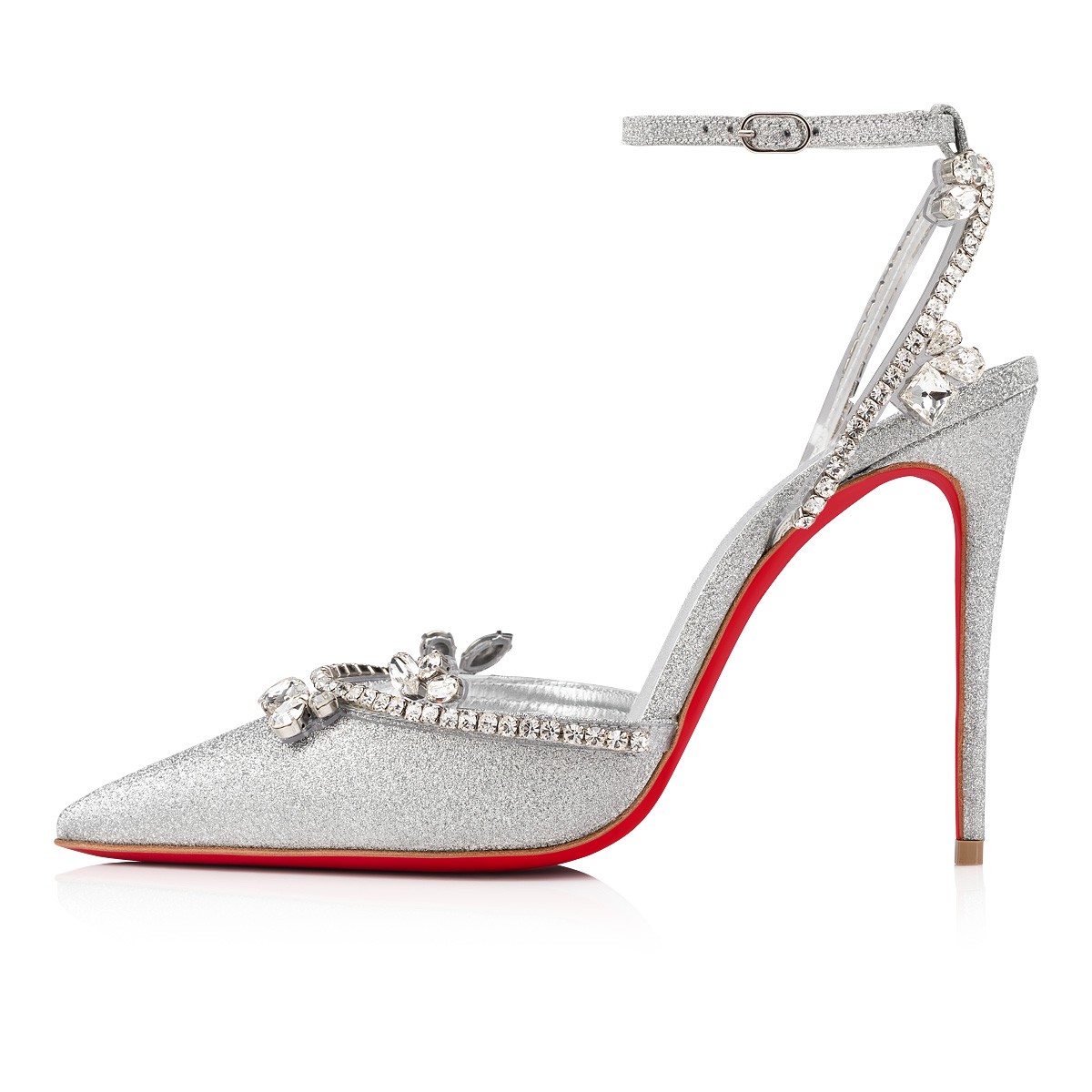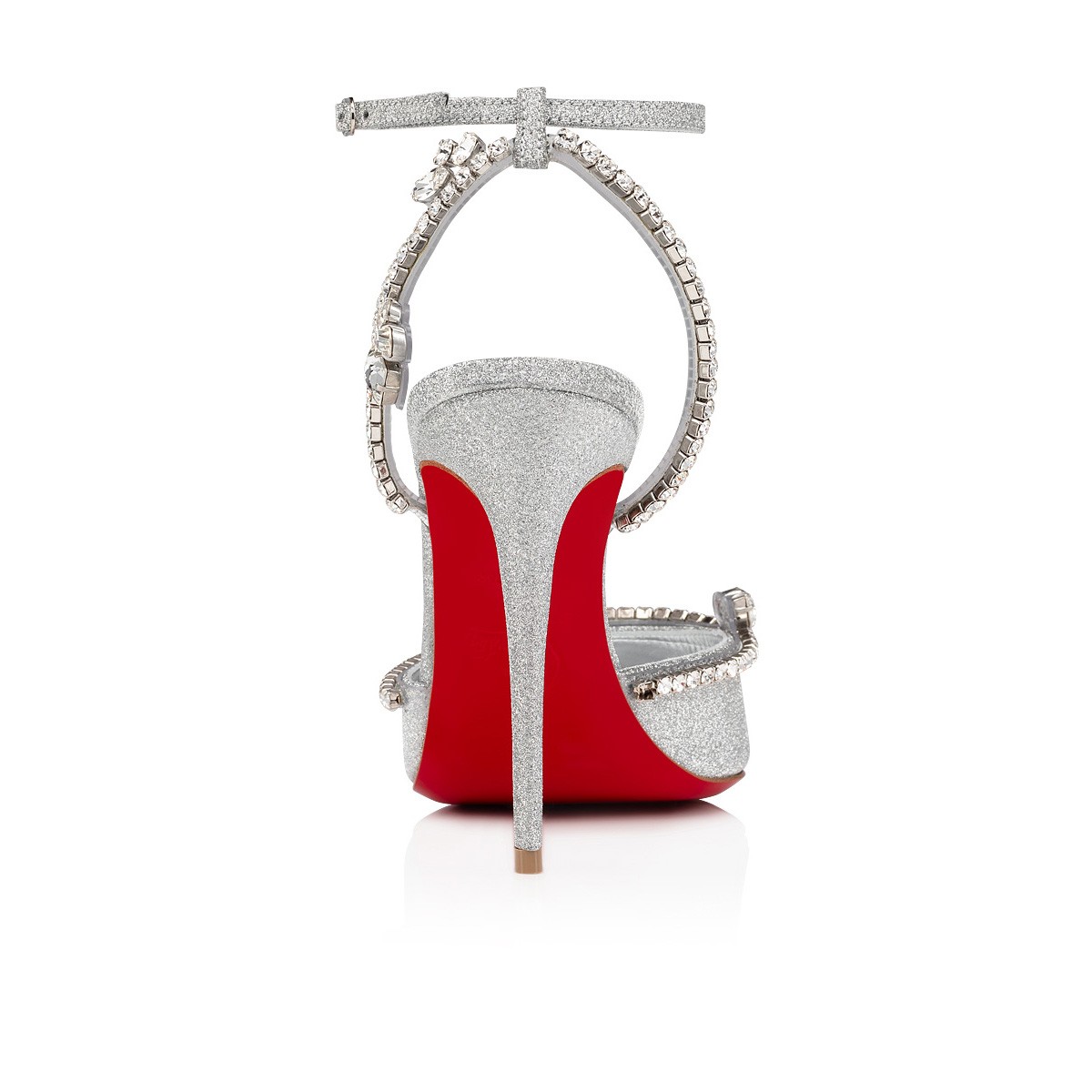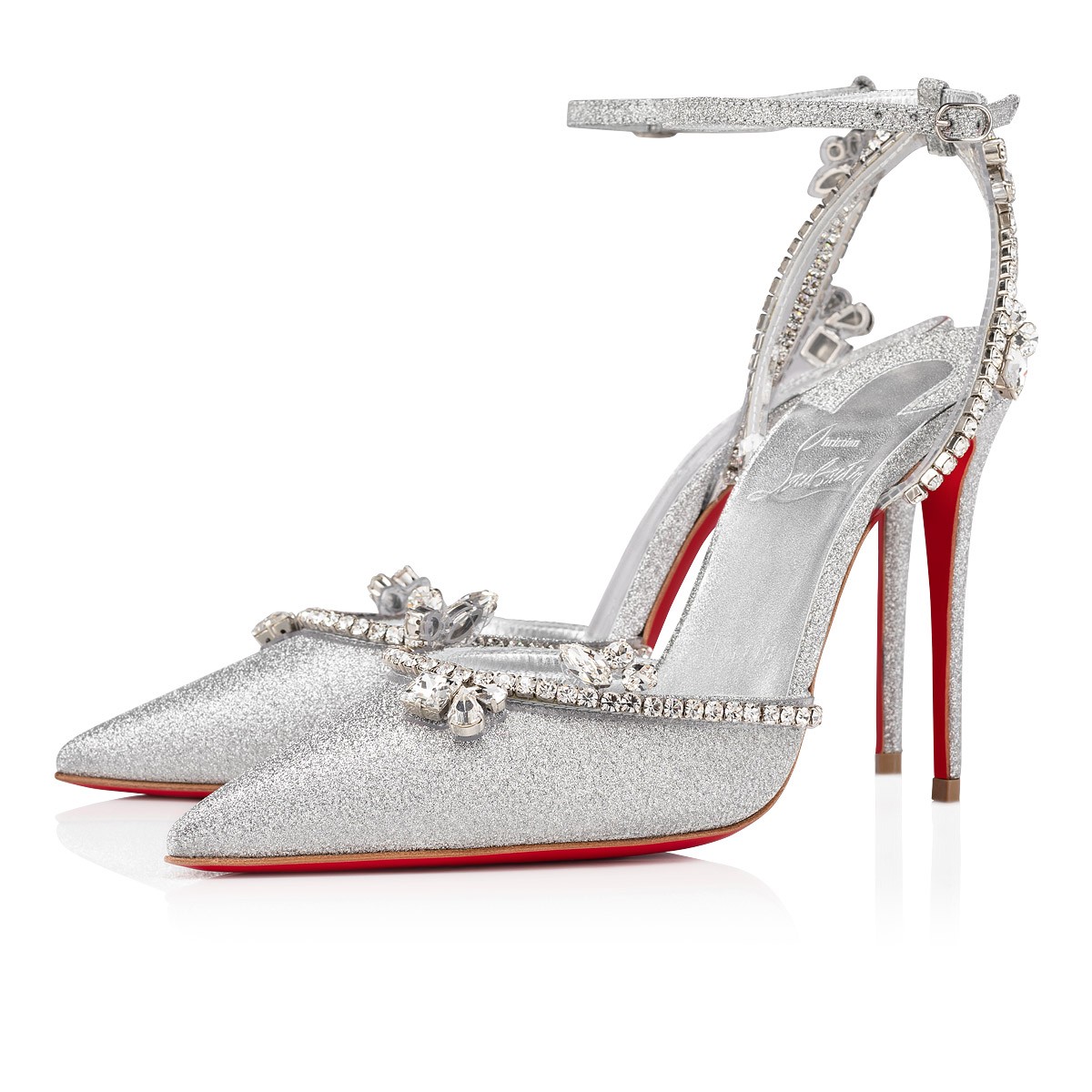 Taking its cue from Maison Christian Louboutin's iconic Spikaqueen and Degrastrass models, the Marykate Queen seamlessly combines a pointy toe box with a dainty ankle strap, resulting in a stunning d'Orsay sandal. The wrap-around ankle strap is crafted from silver-tone glitter-embellished calf leather, perched over a 100 mm stiletto heel, clad in the same creative material. Two decorative straps are adorned with strass and gemstones for a truly show-stopping finish.
