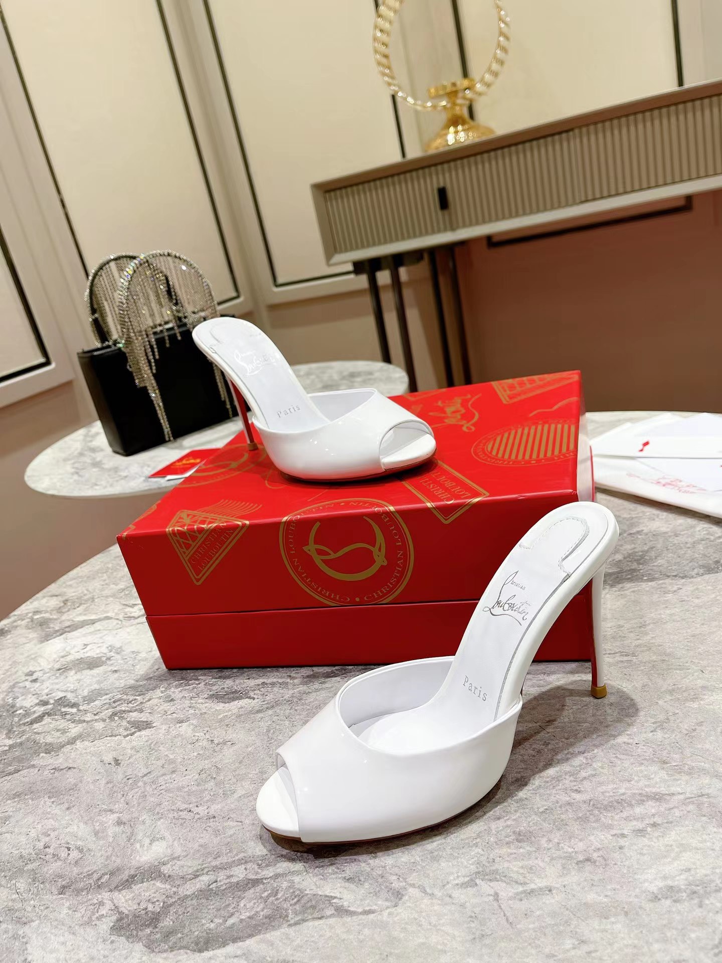 【Christian Louboutin】クリスチャン ルブタン Me Dolly 100 mm Mules Patent Calf Bianco