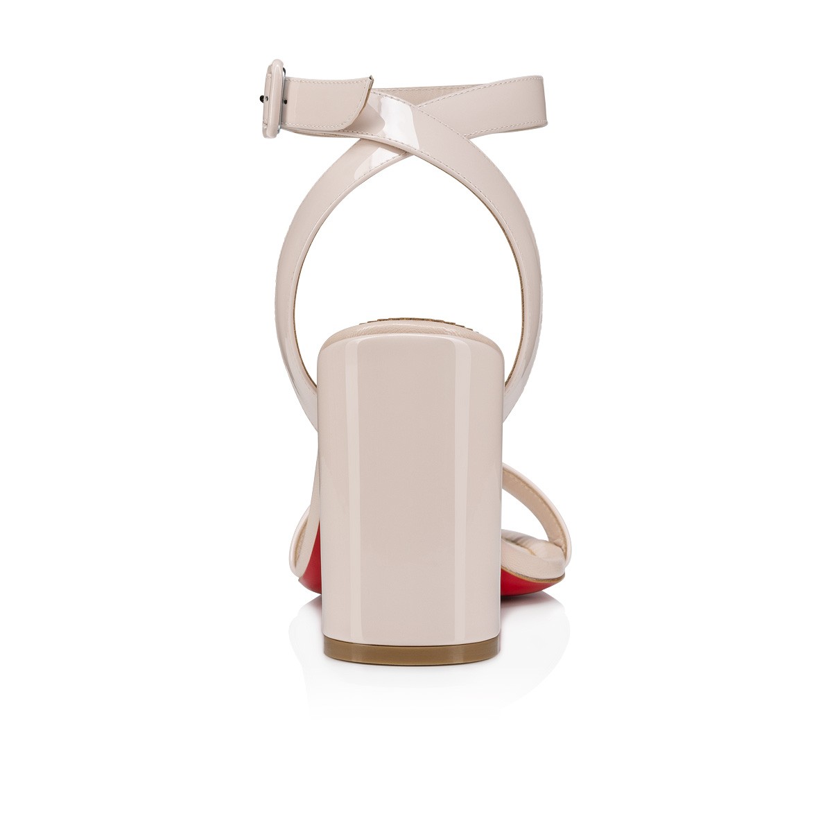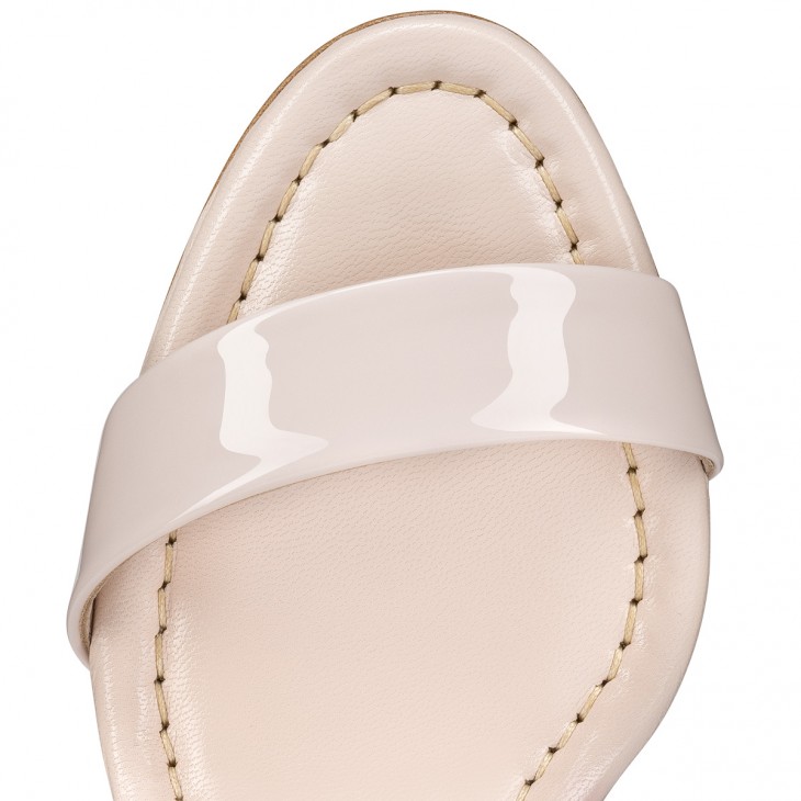 The iconic Miss Sabina is back, with its 85 mm signature Turela heel. The curvy lines of this sandal reveal Maison Christian Louboutin's emblematic red sole to its full effect. This style is ideal for all-day wear. It features an elegant strap across the toe and another winding around the ankle and fastening with a buckle. It is crafted in Leche beige patent leather with tonal lining.