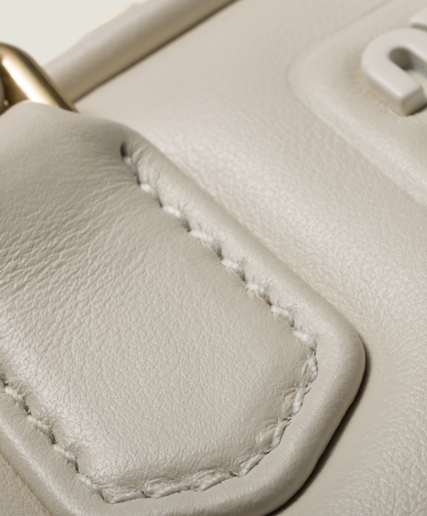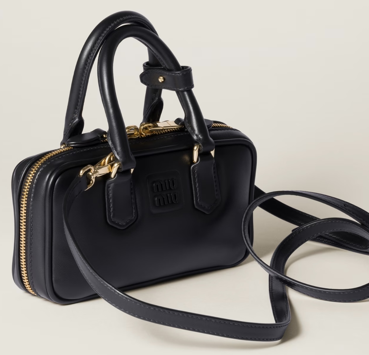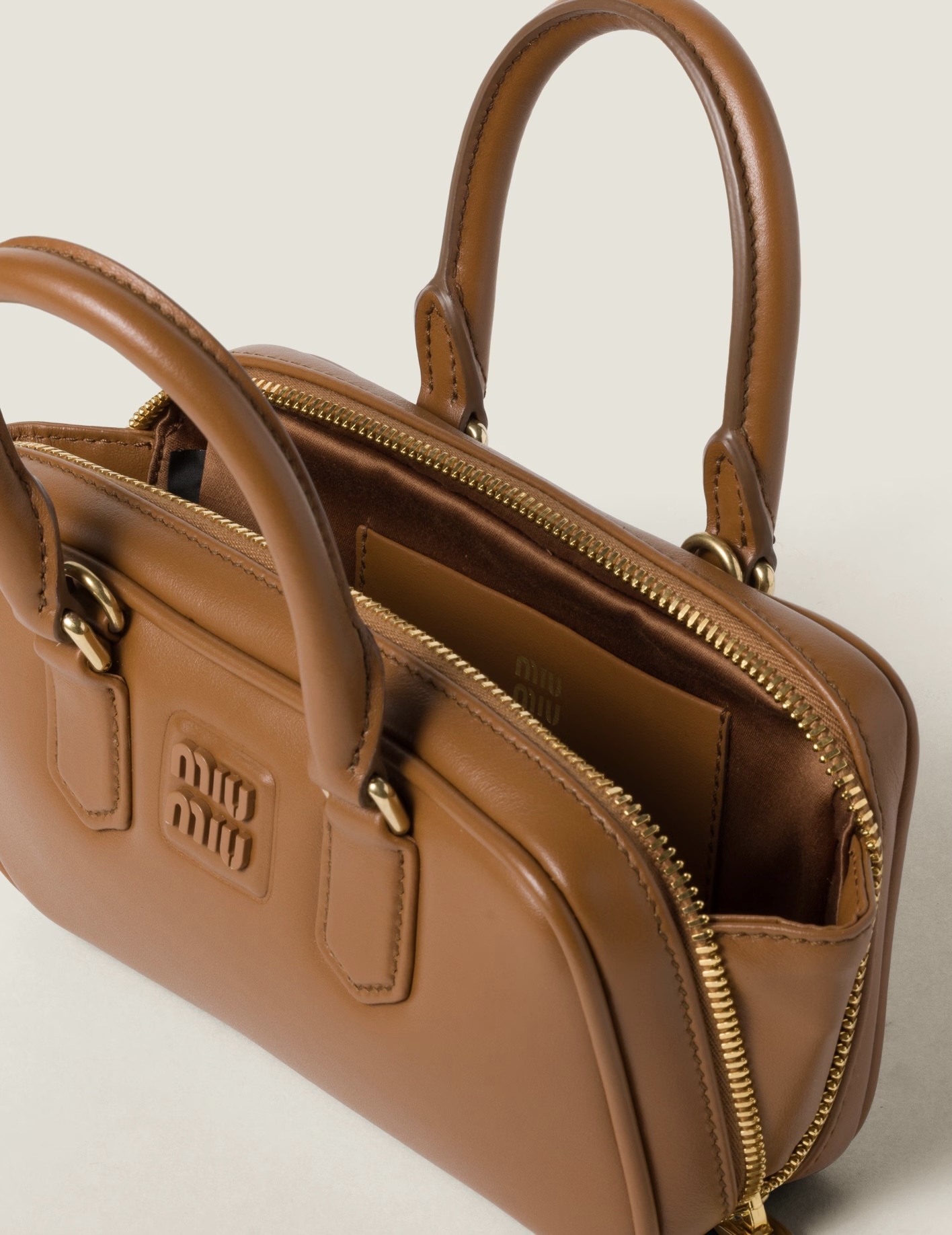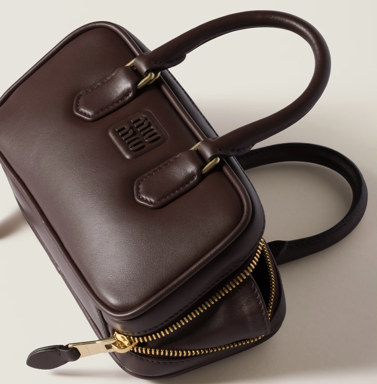 フロントにバーニッシュ仕上げのメタルのMIU MIU ロゴ