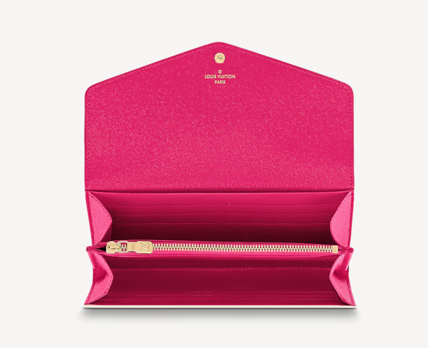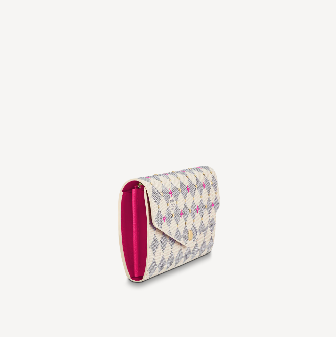 「ダミエ・アズール スタッズ」コレクションのスペシャルエディションのために再解釈された「ポルトフォイユ・サラ」。ダミエ・アズール キャンバスに、フューシャピンクのフラワー・モチーフのプリントと、繊細なゴールドカラーのスタッズをあしらいました。「Louis Vuitton」の刻印入りのスナップボタンで開閉するエンヴェロップ型の財布は、実用的で多機能な整理しやすい内装も魅力です。