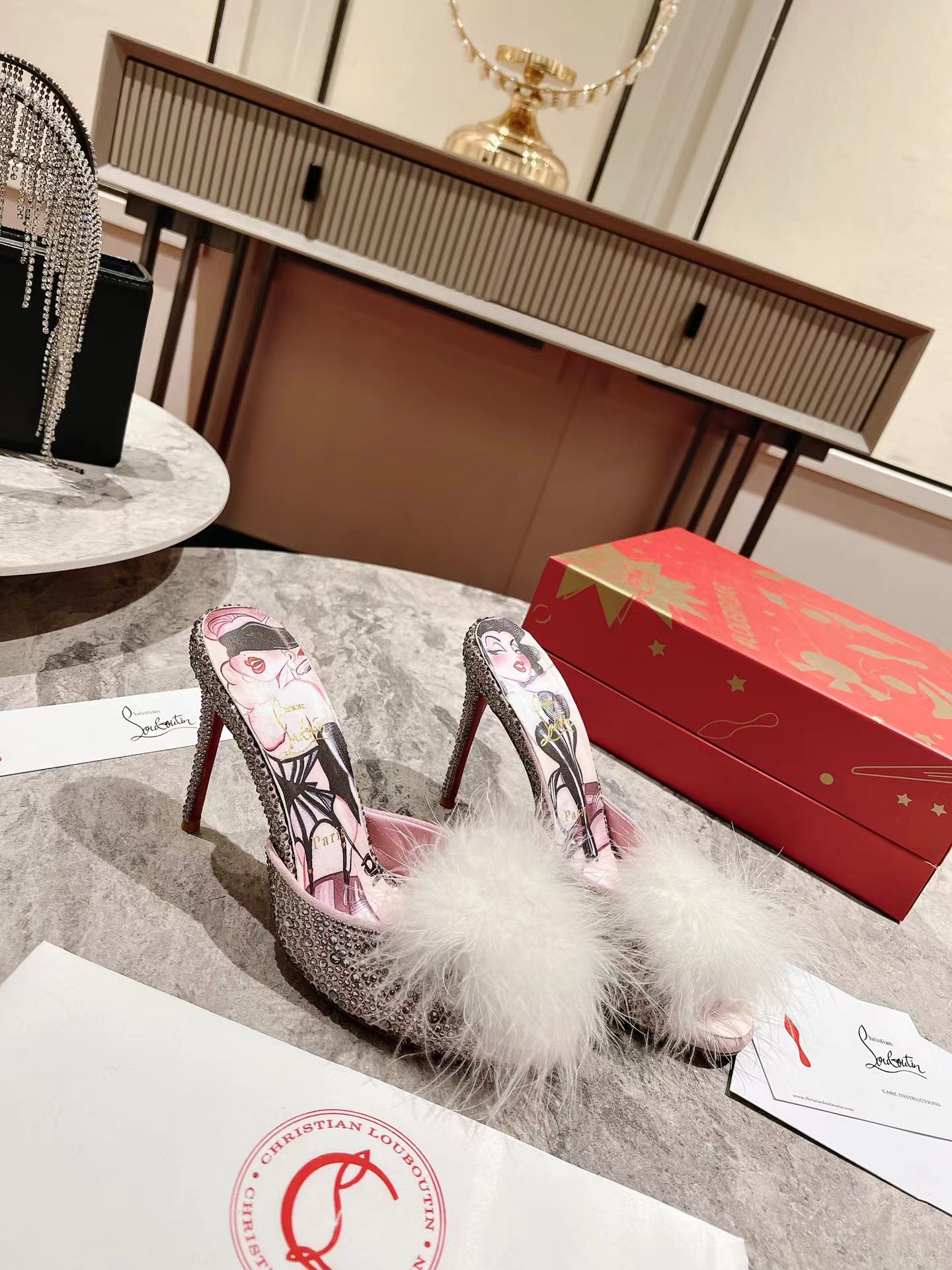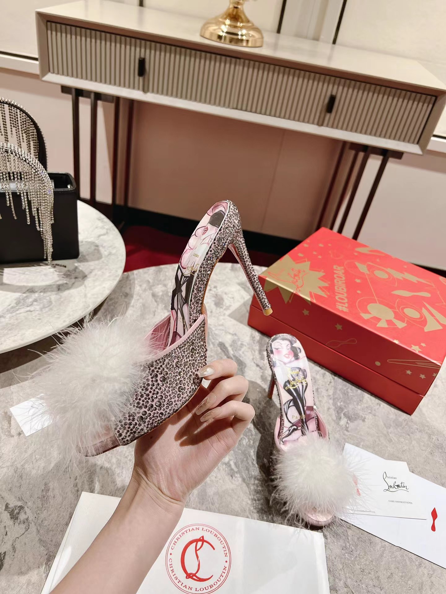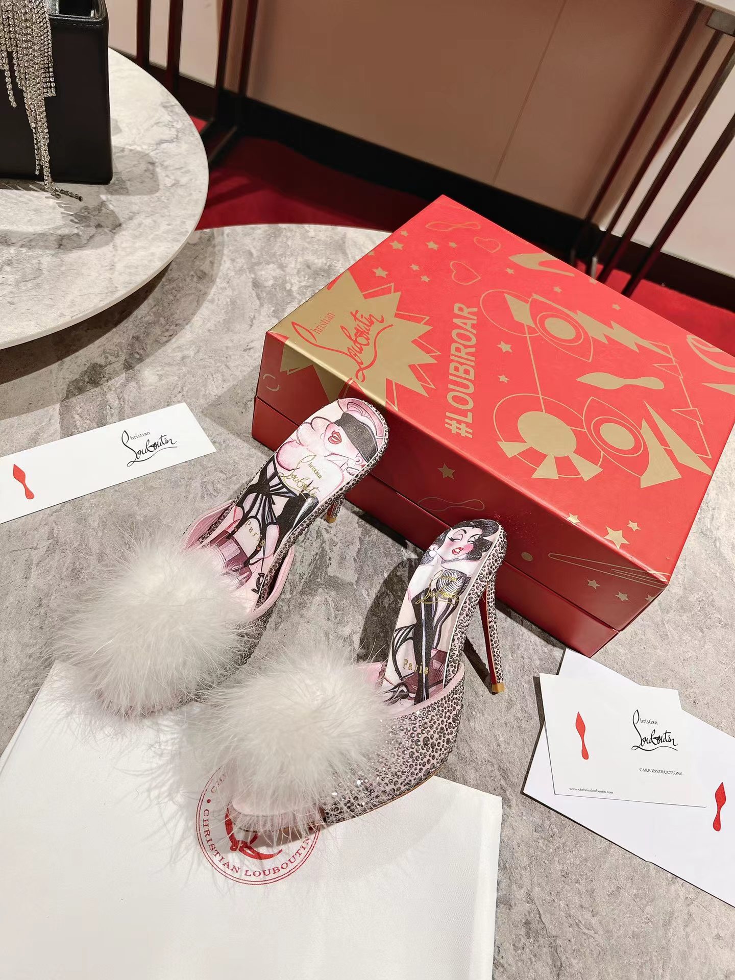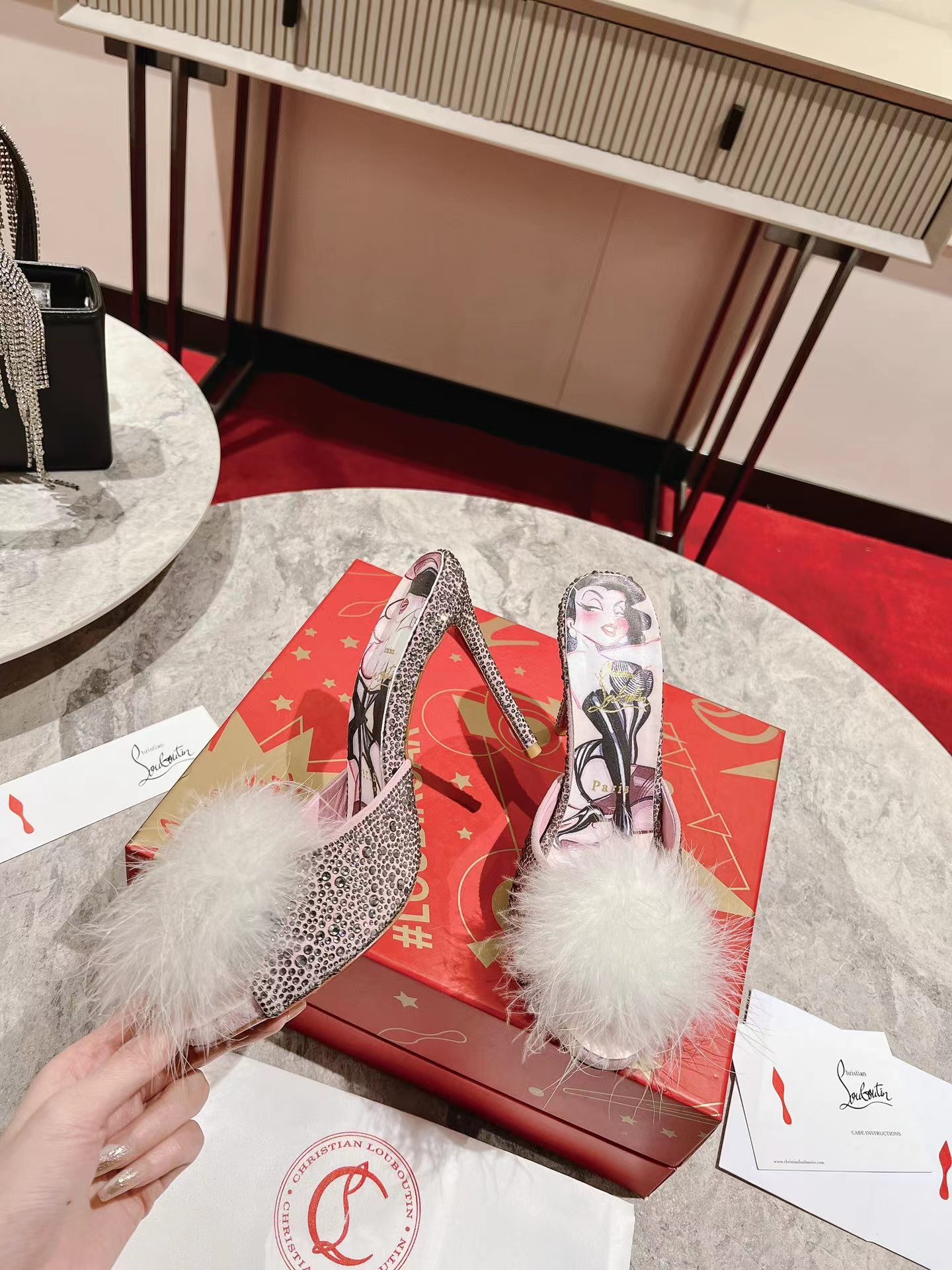 Christian Louboutin released two new mules, Pin Up 100 mm and Pin Up Strass 100 mm. They are both limited edition and designed by Doctor Bored. The fluffy mules are inspired by the pin-ups and offer an exquisite visual experience. An eye-catching feature of these heels is the pin-up print on the inner sole, and each pair offers a different print!