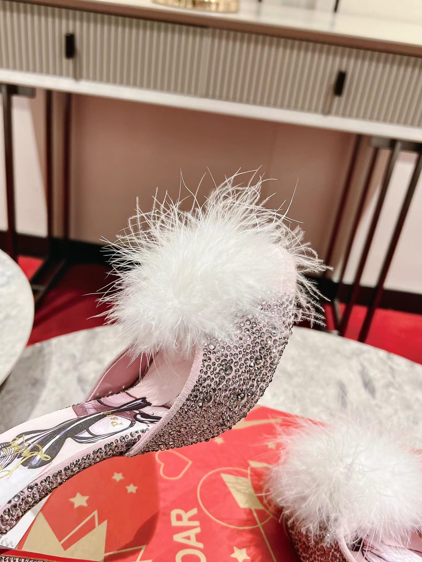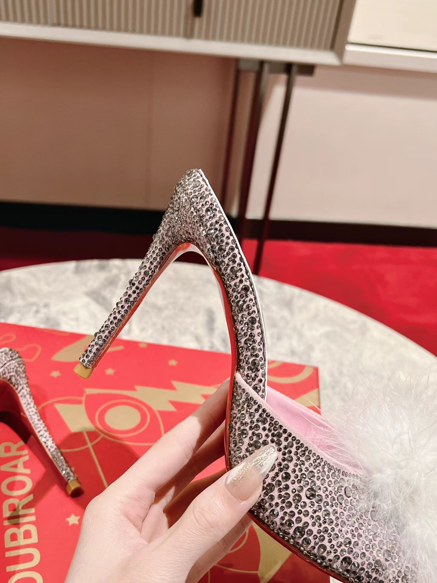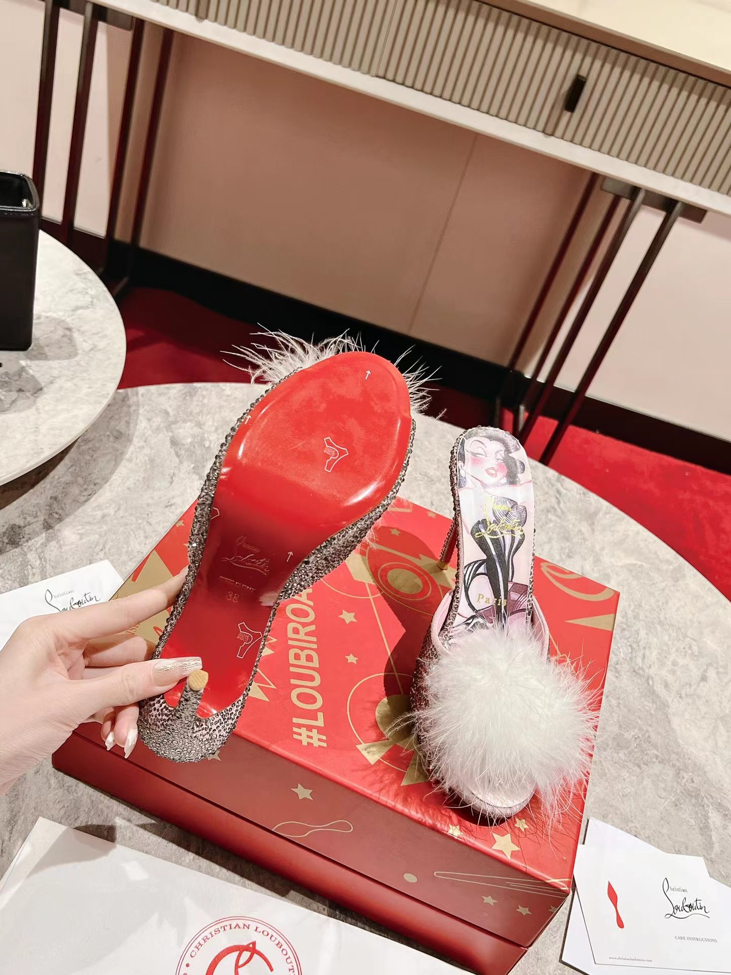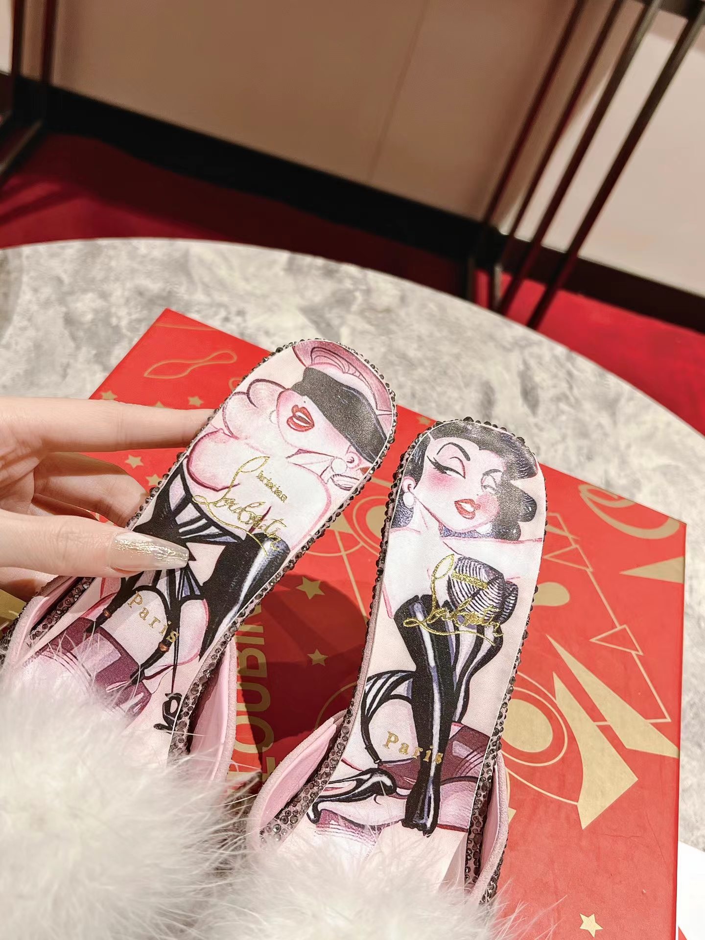 Christian Louboutin released two new mules, Pin Up 100 mm and Pin Up Strass 100 mm. They are both limited edition and designed by Doctor Bored. The fluffy mules are inspired by the pin-ups and offer an exquisite visual experience. An eye-catching feature of these heels is the pin-up print on the inner sole, and each pair offers a different print!