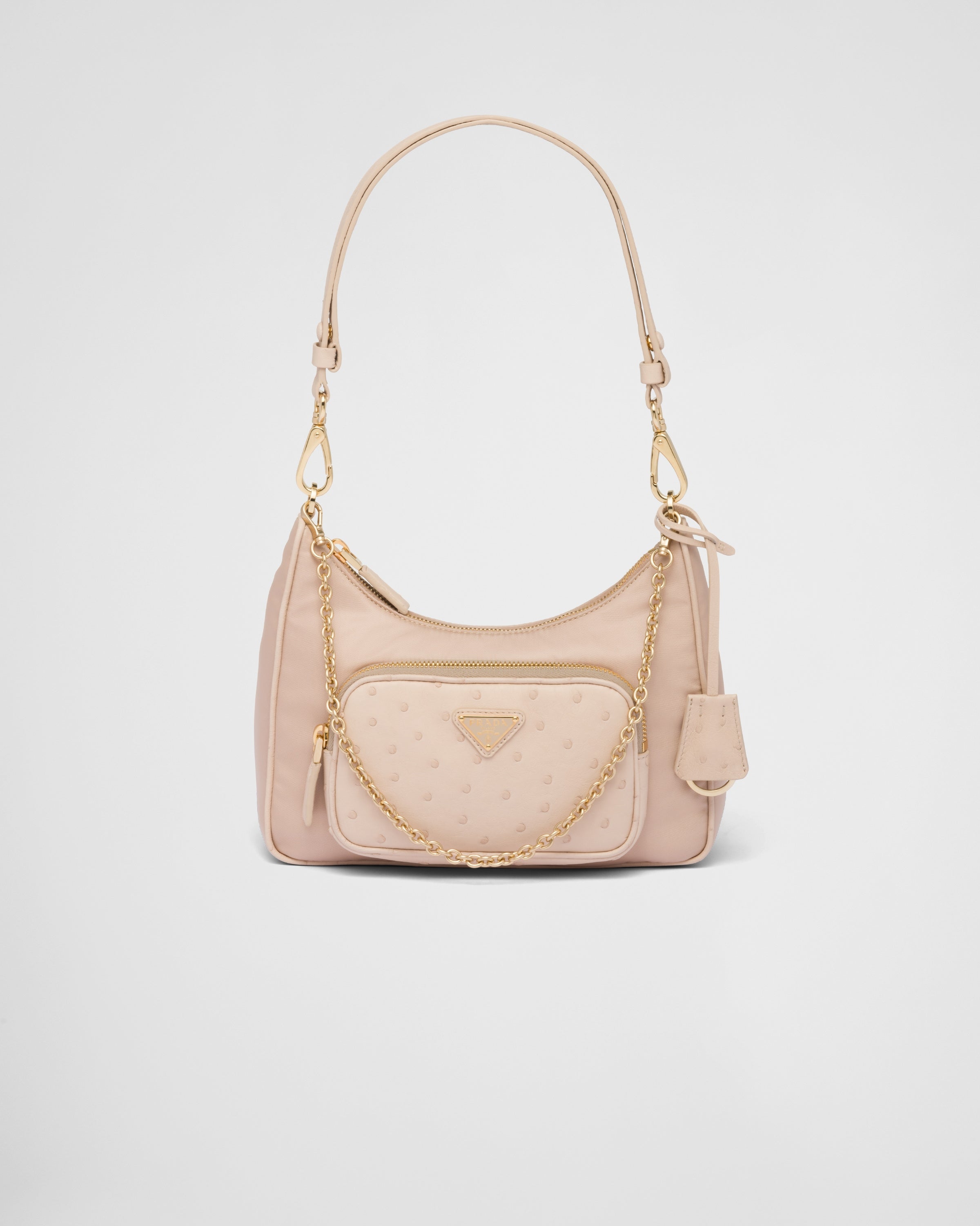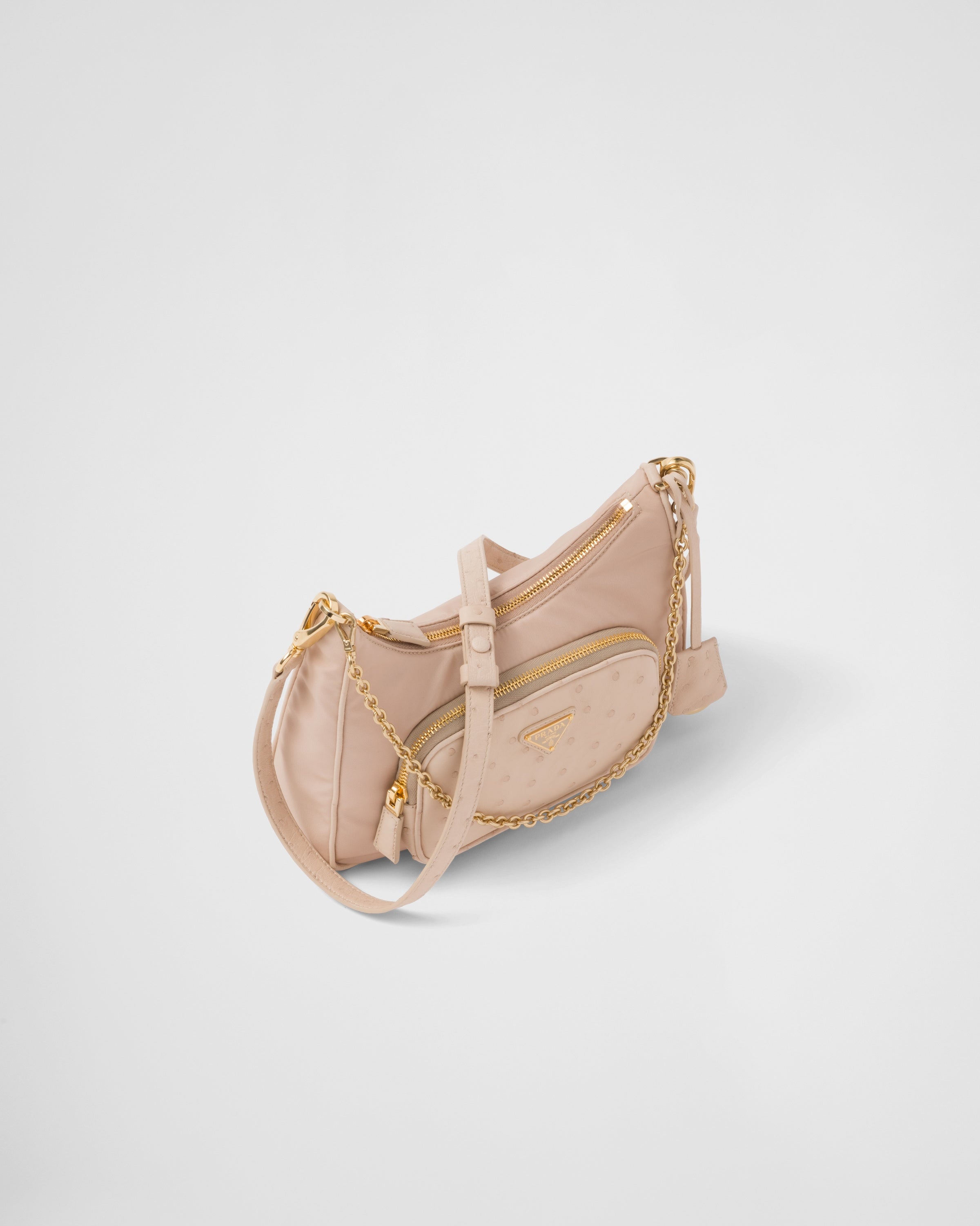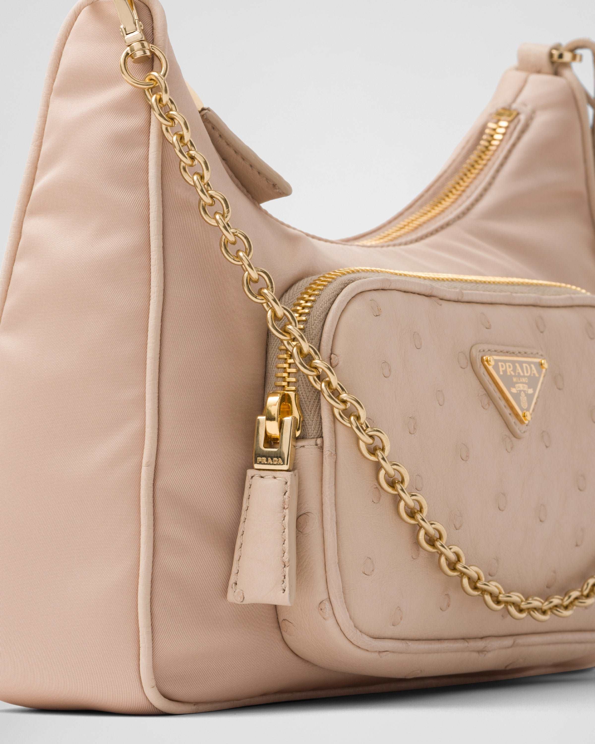 高い耐久性と品質を誇るレザーでありながら、繊細な表面が魅力のオーストリッチは、突起した独特の質感で知られています。そのオーストリッチに、工業用ファブリックをサステイナブルに進化させたプラダ独自のRe-Nylonを融合したミニバッグ。この素材のミックスはブランドの二元性の精神を表現しています。