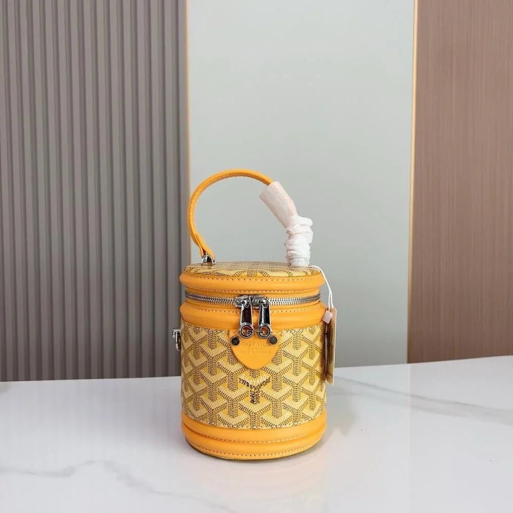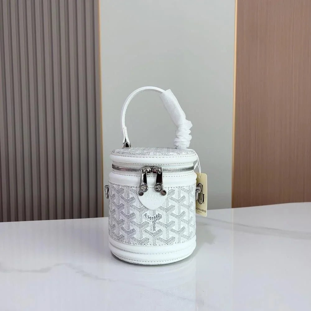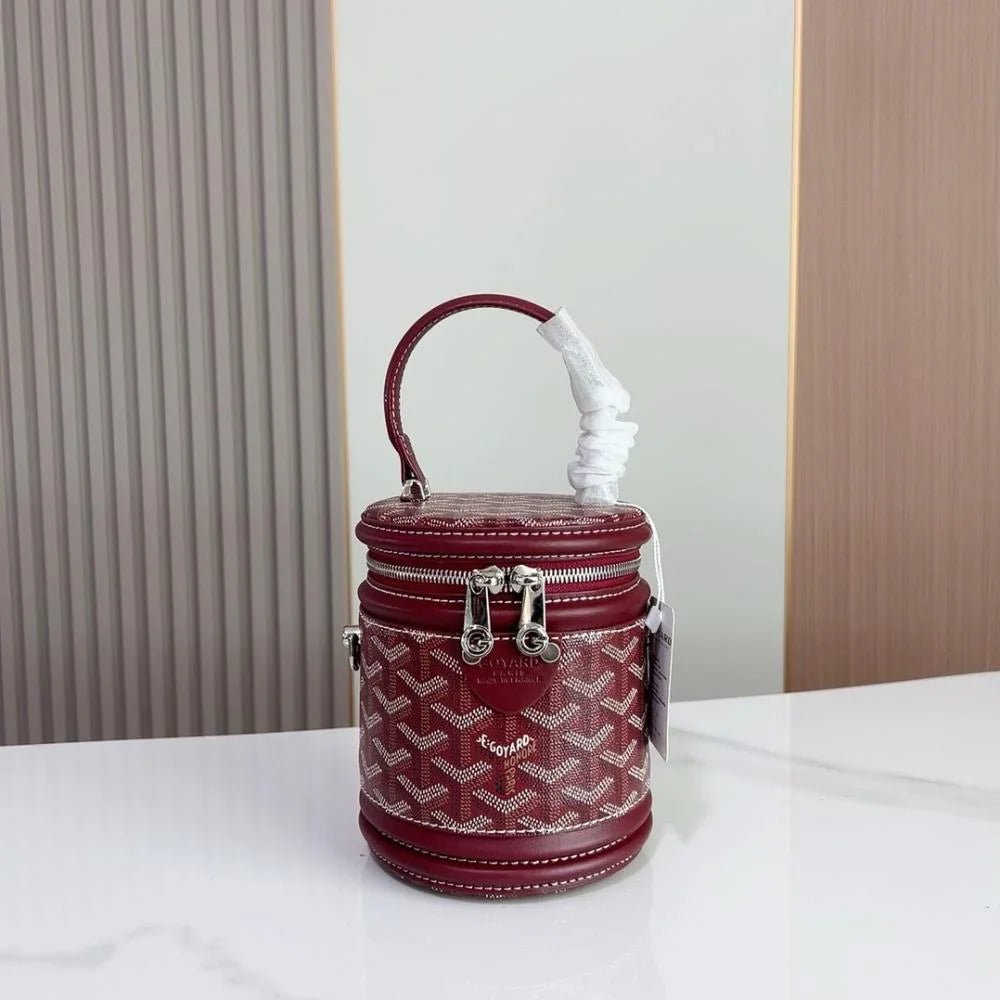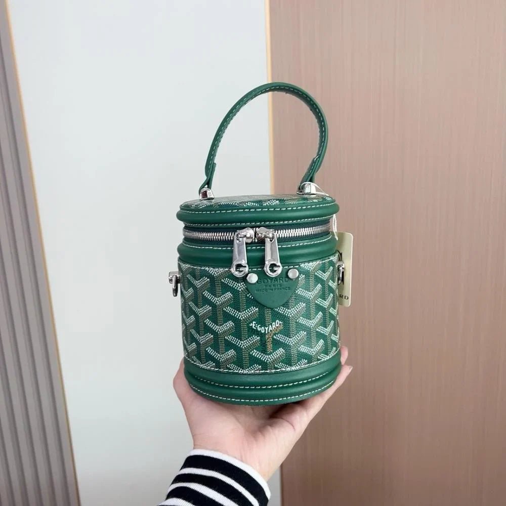 The Rouette Cylindre Bucket is a luxury-inspired handbag modeled after the Goyard bucket design, combining bold elegance with everyday practicality. Its unique cylindrical silhouette and striking finish make it a standout accessory for any occasion.