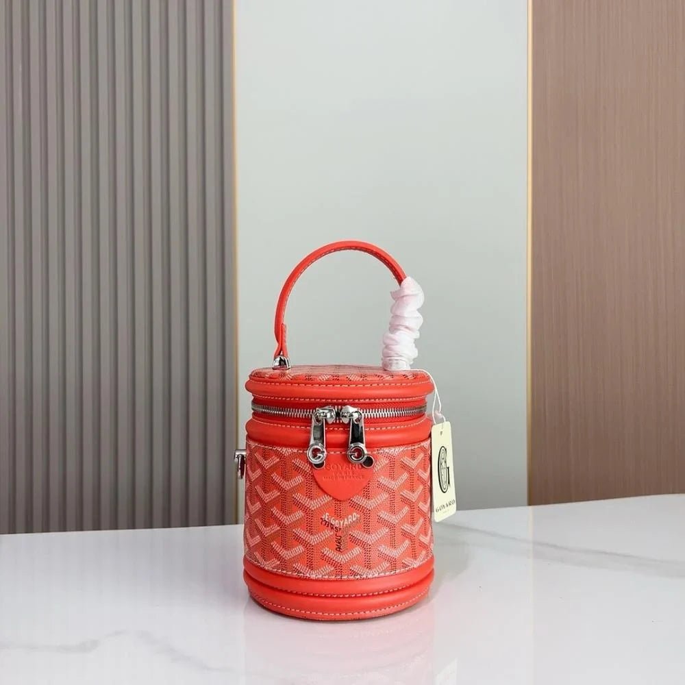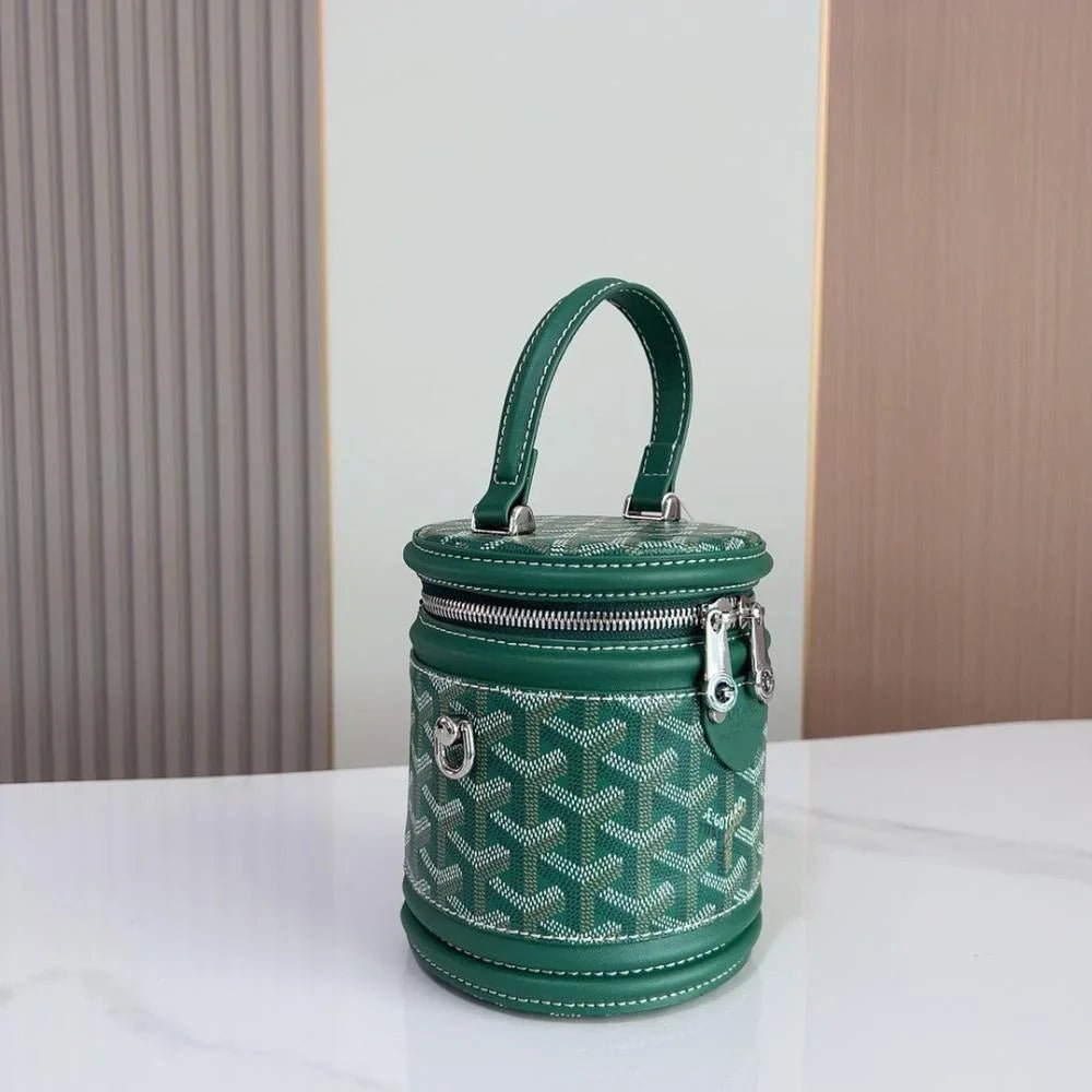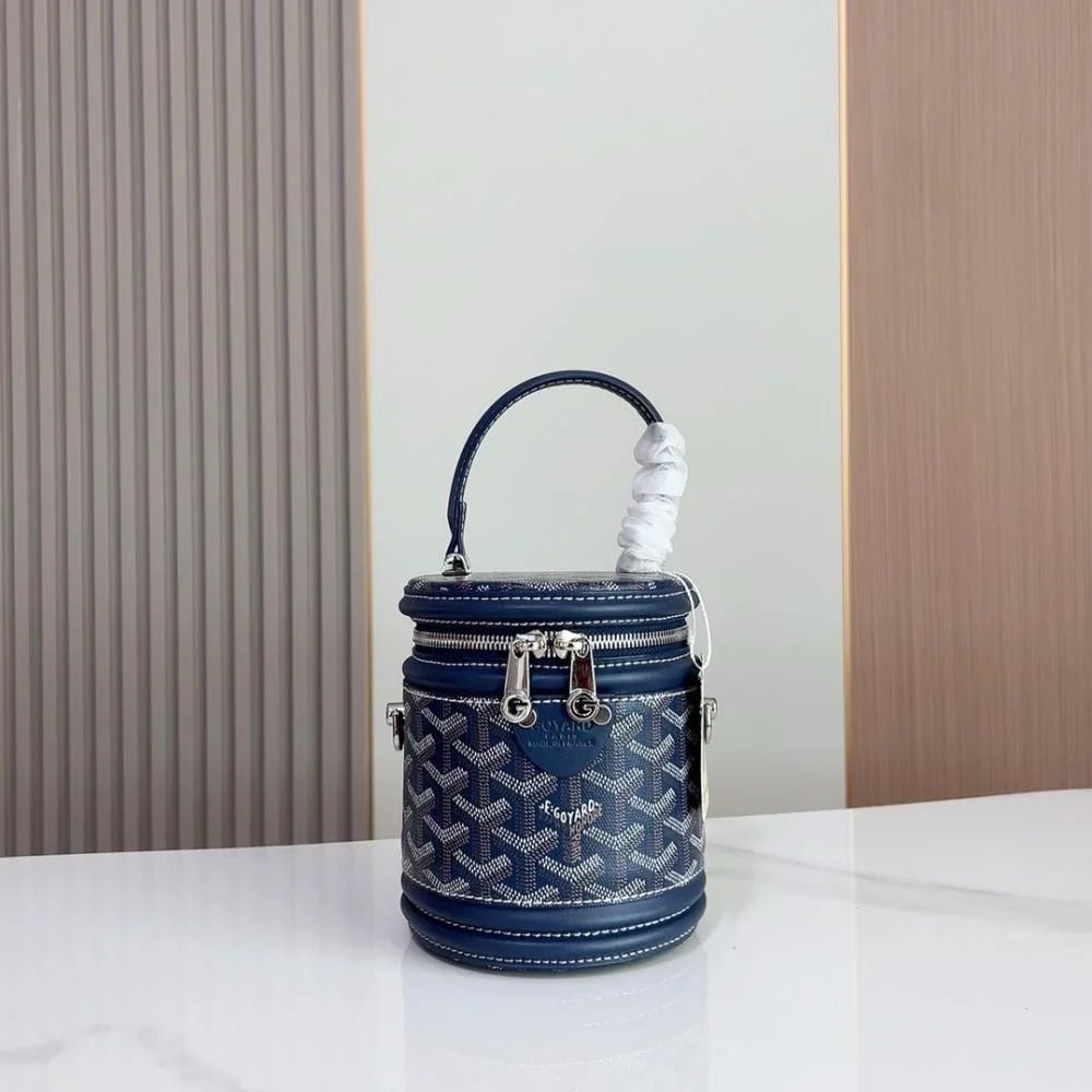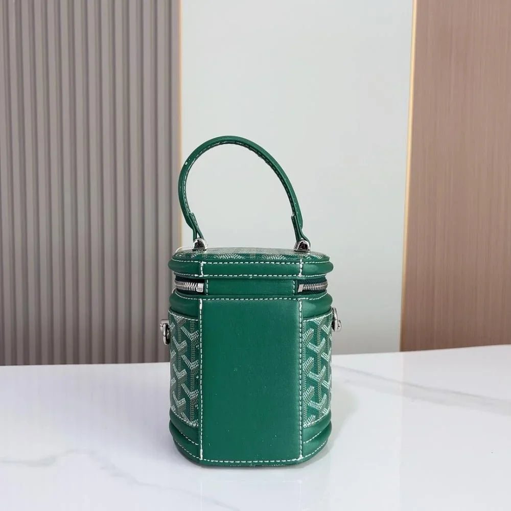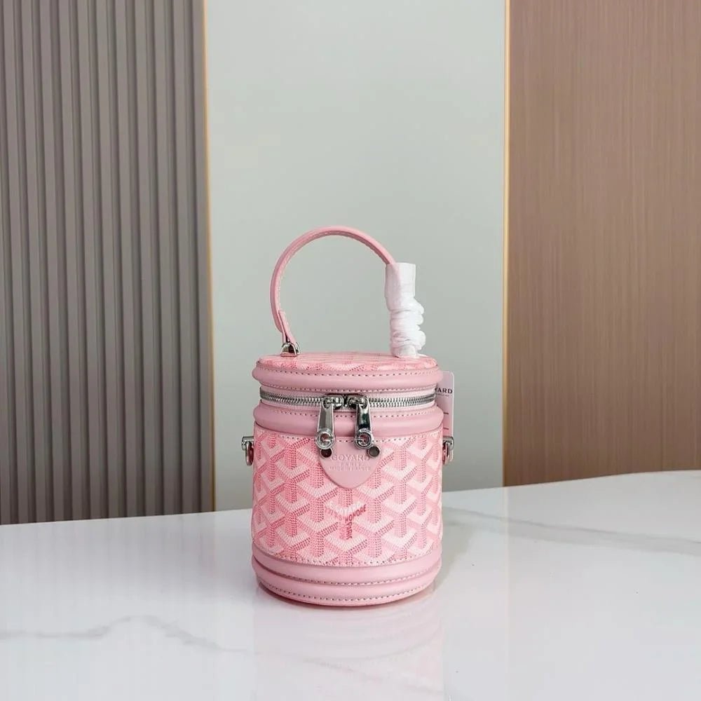 The Rouette Cylindre Bucket is a luxury-inspired handbag modeled after the Goyard bucket design, combining bold elegance with everyday practicality. Its unique cylindrical silhouette and striking finish make it a standout accessory for any occasion.
