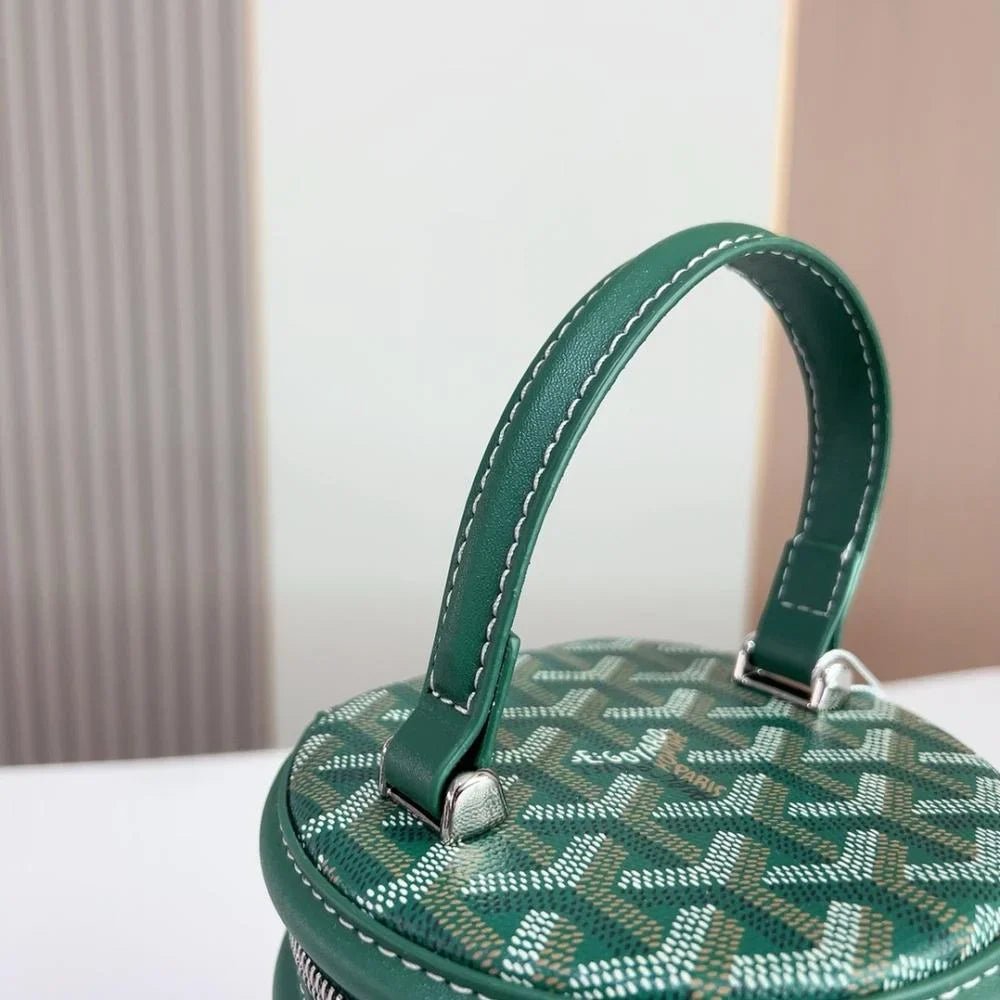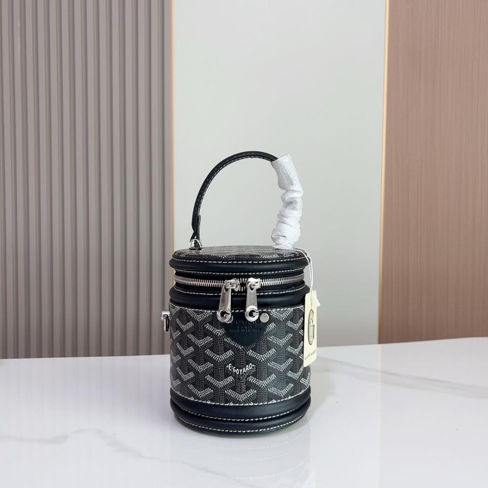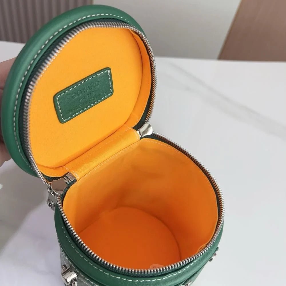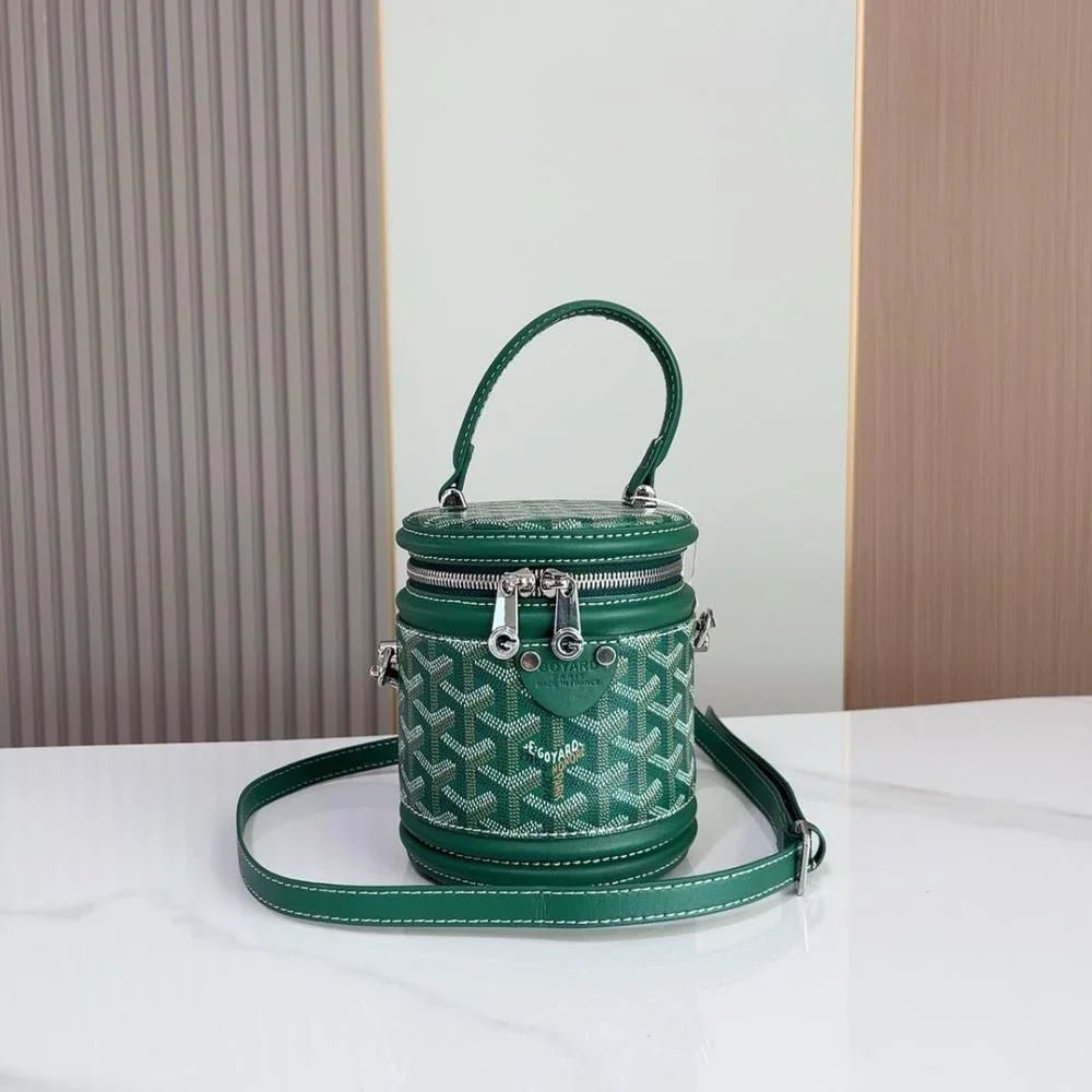 The Rouette Cylindre Bucket is a luxury-inspired handbag modeled after the Goyard bucket design, combining bold elegance with everyday practicality. Its unique cylindrical silhouette and striking finish make it a standout accessory for any occasion.
