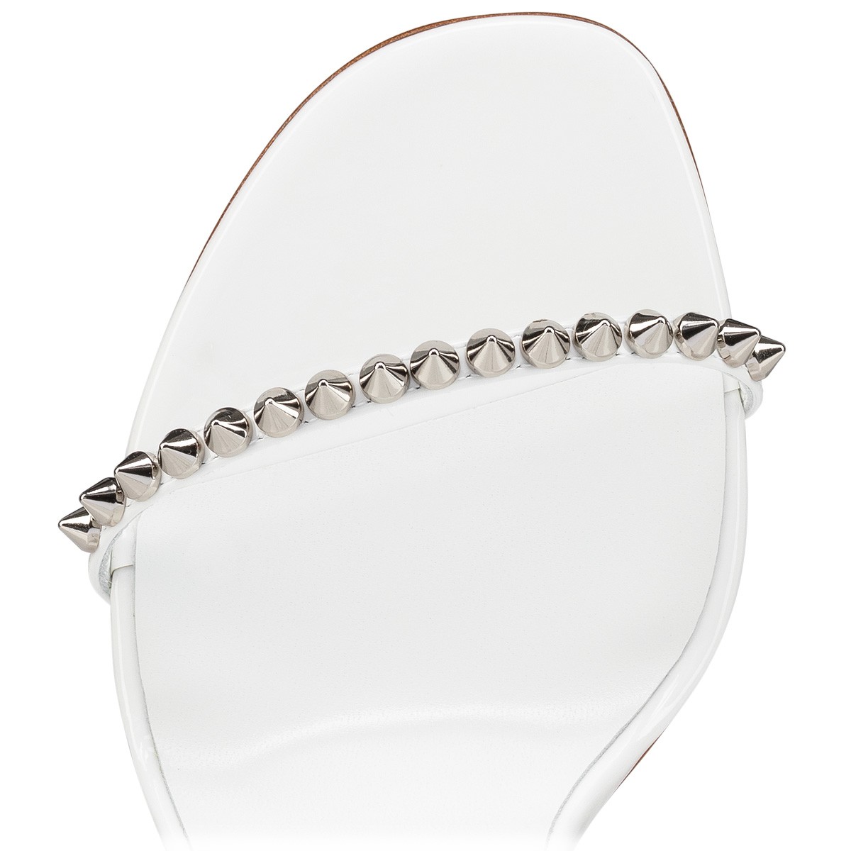 Inspired by the iconic Loubi Queen stiletto, the powerful So Me sandal by Maison Christian Louboutin cuts a striking silhouette with signature glossy tonal spikes adorning the toe and heel straps, an elegant pronounced arch, and a delicate 100 mm heel. This model is crafted in all-over Bianco white, showcasing patent leather and a tonal lining.