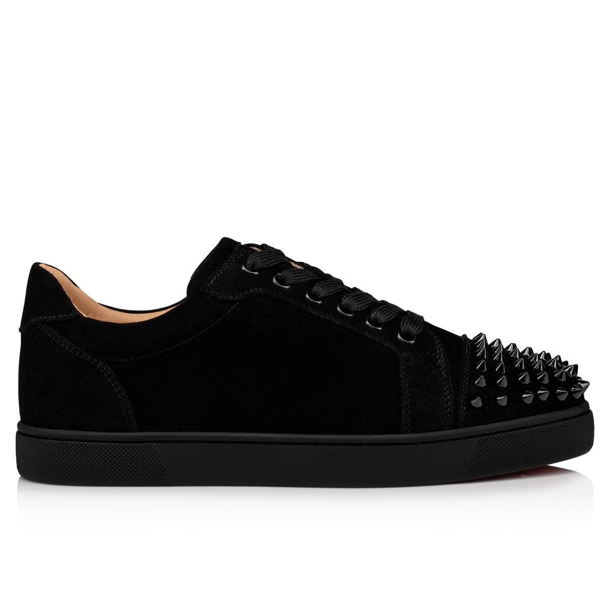 Taking its cue from the classic tennis shoe, the Vieira Spikes deftly combines Old Skool style with contemporary design elements. The upper on this flat low-top sneaker is crafted from black veau velours suede and finished with tone-on-tone laces, eyelets and a creeper sole. For that inimitable touch of Louboutin theatrics, the toecap is studded with all-over black metallic spike embellishments.