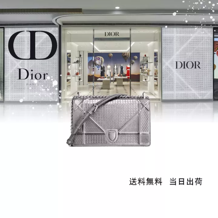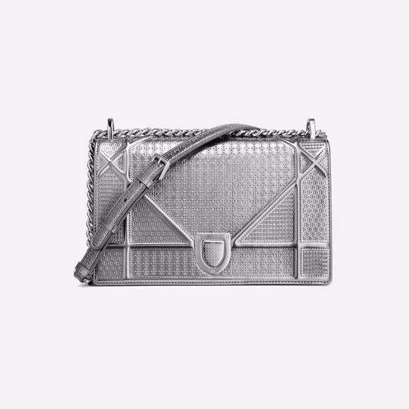「Dioram」銀色の金属光沢Mirocannageミニ藤格子模様牛革チェーンの手にバッグを持ち、銀色の金属アクセサリーをあしらった。